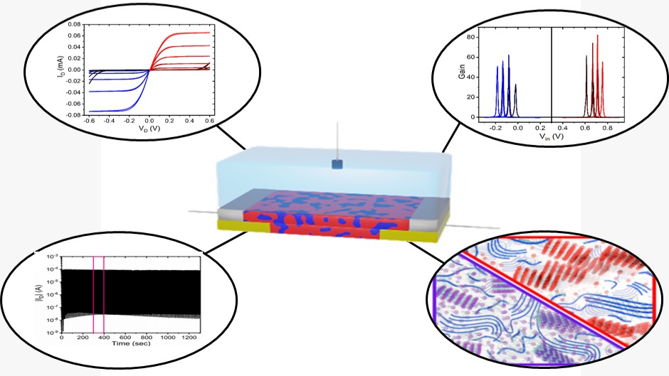 Organic electrochemical transistors (OECTs), which rely on organic mixed ionic–electronic conductors (OMIECs) to modulate bulk conductivity through ion exchange with an electrolyte, are increasingly used in bioelectronics, energy storage, actuation, and sensing. We recently introduced a new design paradigm based on blending p-type and n-type OMIECs to achieve enhanced device performance and multifunctionality. By tuning the blend composition and applying thermal treatments, we precisely control microstructural features such as phase separation, crystallinity, and domain morphology—optimizing both ionic and electronic transport and their coupling. This strategy enabled the realization of fully balanced ambipolar OECTs capable of modulating both cations and anions in a single device. Moreover, we extended this approach to create dual-mode transistors that combine OMIECs and organic semiconductors, allowing operation as both an Electrolyte-Gated Organic Field-Effect Transistor (EGOFET) and an OECT. Controlled phase separation facilitates seamless switching between these modes. Our results offer a new materials framework for designing tunable, multifunctional organic transistors with improved ionic–electronic coupling—advancing the development of next-generation bioelectronic interfaces and sensing technologies.