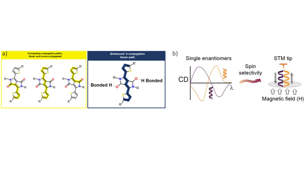 Providing global energy supply in a sustainable manner is one of the main challenges of our generation. We are therefore, in the urge to find alternative resources and materials. In this sense, organic materials are the best candidates to fabricate electronic devices since we can tailor their properties by molecular design. They have other advantages such as flexibility, light weight, portability and scalability. Still, the efficiency of organic devices is far from the one of inorganic materials or perovskites. Despite the progress made in the field, the race for achieving efficiency records, has hampered research focused on solving other fundamental issues, such as device morphology and charge recombination. In this talk, I will show different strategies to demonstrate how noncovalent interactions can enhance charge transport and device efficiency in organic electronic devices (Figure 1).1,2 In our group we incorporate hydrogen bonds to extraordinarily small semiconductors to enhance charge carrier mobility and lifetime,3,4 and introduce chiral centers to explore the Chiral Induced Spin Selectivity (CISS) effect to decrease charge recombination.5 The synthesis, self-assembly and optical properties will be shown and correlated to the charge transport results obtained by using electrodeless techniques and full devices. The spin selectivity results explored by scanning tunnel microscopy (STM) on spectroscopy mode (STS), show how it is possible to guide charge carriers through chiral supramolecular structures (Figure 1b).5
