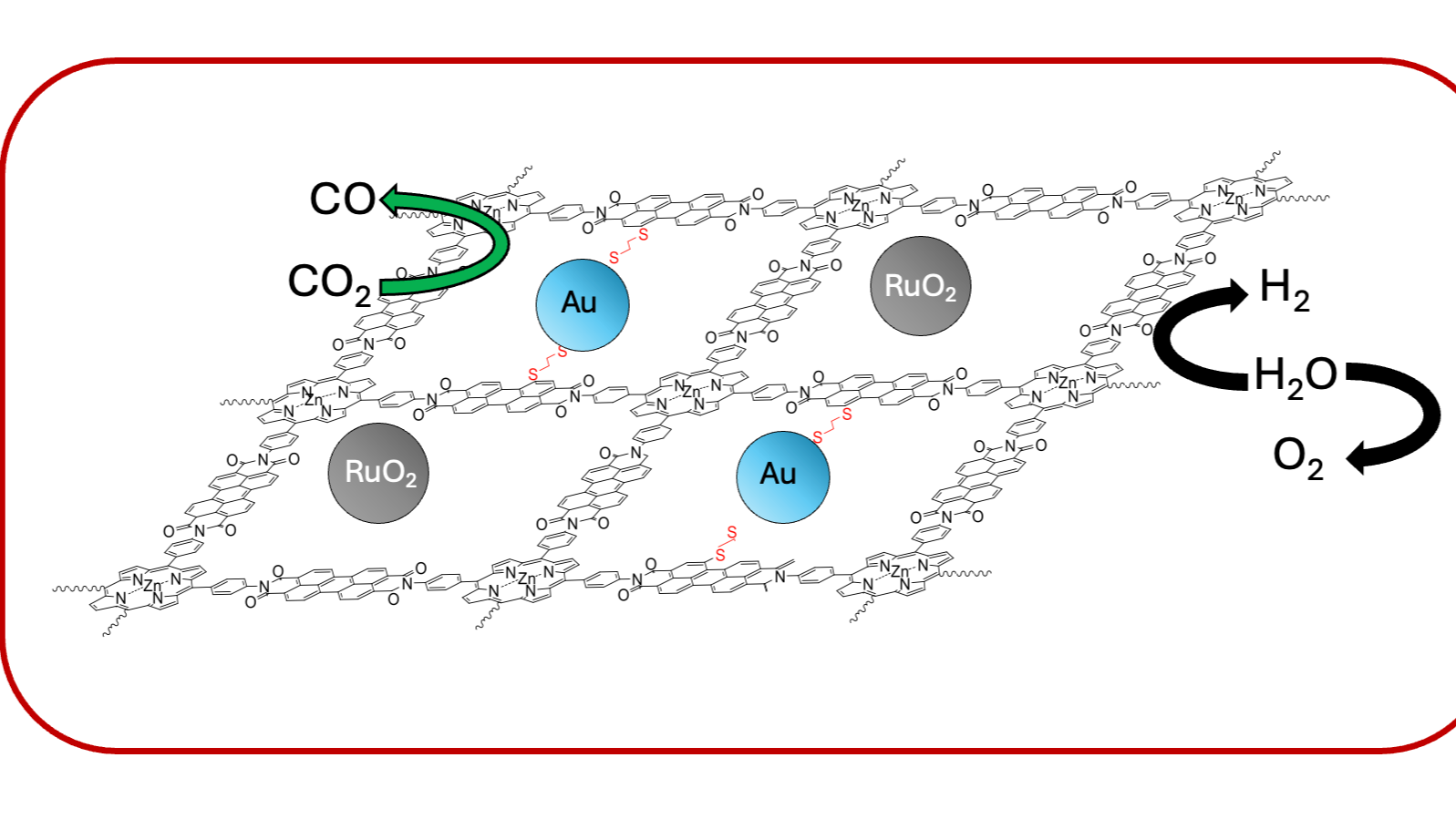 The incorporation of metal catalysts, such as metal nanoparticles (MNPs), into these types of organic, photo-active supports creates a hybrid material which can facilitate redox reactions; electrons excited within the framework can be accepted by the MNP and subsequently used to carry out CO2 reduction. MNPs are widely used for catalysis due to their high surface energy and quantum size effects; particularly, gold nanoparticles (Au NPs) are highly selective towards CO2 reduction to CO. However, their aggregation can result in gradual loss of catalytic activity, therefore uniformly immobilising them on light-harvesting, porous supports is effective in extending their photocatalytic performance. Additionally, RuO2 NPs are impregnated into the remaining COF pores to help retain photogenerated holes and facilitating the oxidation of water; RuO2 NPs possess excellent affinity toward O2 gas with a favourable O2 binding energy, low overpotential, and high OER activity.