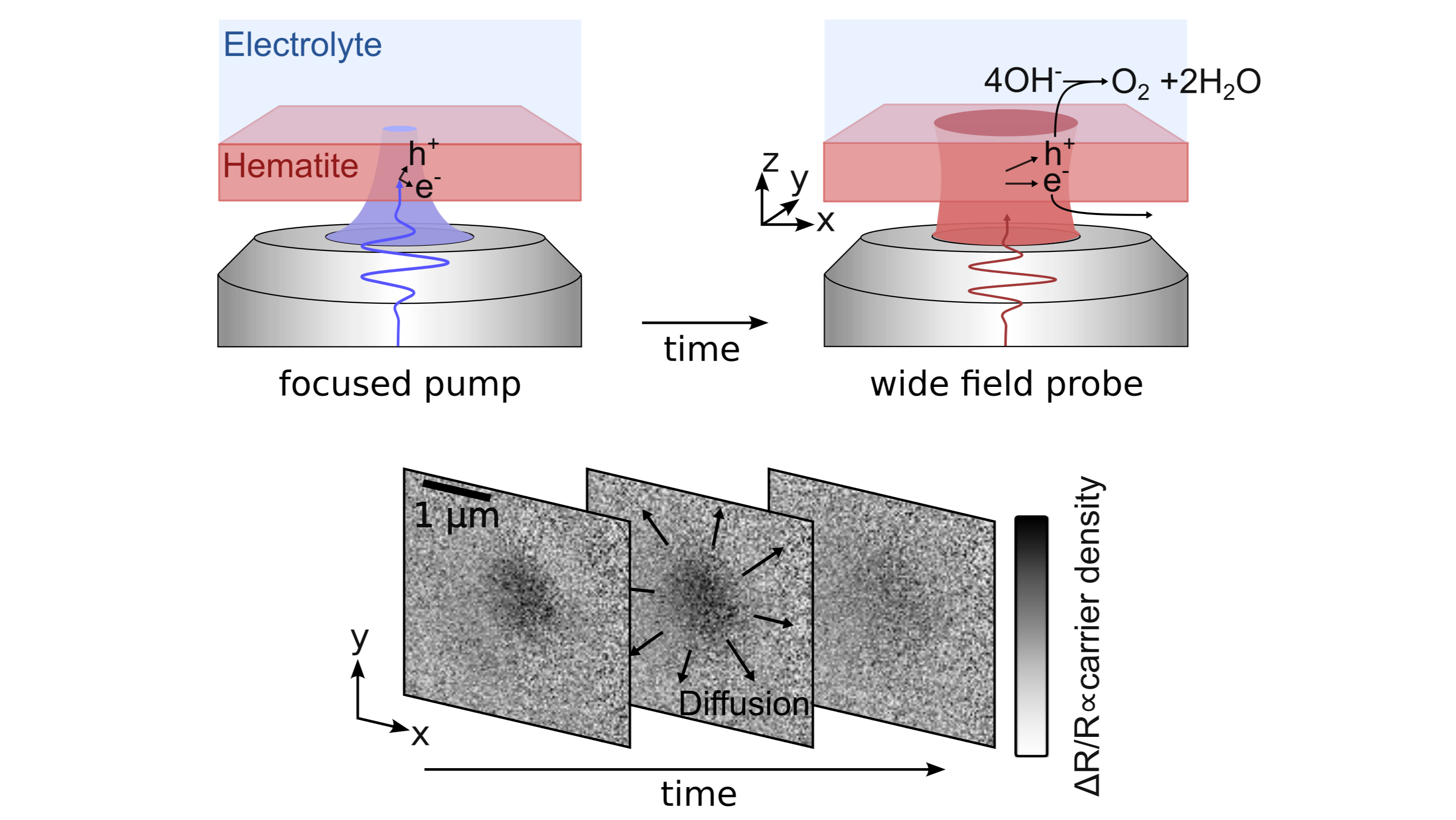 A major challenge in solar fuels is to identify and control the multiple factors that determine the efficiency of the light-driven molecular transformation under realistic operating conditions. In semiconductor photoelectrodes such as hematite, recombination and trapping of photogenerated charge carriers compete with their transport to the electrode-electrolyte interface, thereby limiting overall conversion efficiency. While these processes have been studied at microscopic spatial scales [1] or ultrafast temporal timescales [2], their simultaneous investigation remains largely underexplored. In particular, direct characterization of carrier transport is missing. Despite carrier diffusion length being a critical parameter in the calculation of photo(electro)chemical efficiency, it is rarely known.