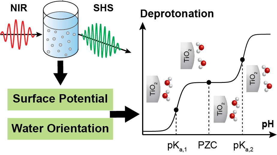 A detailed understanding of the microscopic structure at the semiconductor nanoparticle–liquid interface is essential for optimizing surface-mediated chemical reactions. In particular, both the electrical double layer structure and the surface protonation state can significantly influence photocatalytic reactions by modulating reactant adsorption and electron transfer rates. However, investigating the electrical double layer (EDL) structure and surface acid sites under conditions that closely mimic actual catalytic operation for semiconductor nanoparticles is a technical challenge that requires to probe selectively the few molecular layers of the solid/water interface of a colloidal suspension.