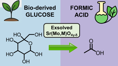 Here we show that a series of perovskites containing exsolved Ru or Ni are active for glucose oxidation to formic acid under more sustainable reaction conditions. We found that complex oxides, Sr(Mo,M)O4γ-δ where M = Ru or Ni, in a pure perovskite, pure scheelite and perovskite/scheelite mixture all produced formic acid, with the pure perovskite phase demonstrating the highest activity - a sustained formic acid yield of ca. 20 % over the 90-minute duration. This value is lower than that of alternative promising Mo-MnOx catalysts [5] (ca. 65 %). However, our values relate to lowered temperatures (100 vs. 160 oC), lowered pressures (ambient compressed air flow vs. 30 MPa O2) and increased glucose:catalyst ratios (10:1 vs. 2:1). Our results demonstrate the promise of perovskite materials to aid in the production of formic acid utilising green feedstocks and sustainable reaction conditions to address global chemical and energy needs. We anticipate these results to be the foundations for development of more tailored perovskite materials to facilitate green formic acid production with sustainable reaction conditions.