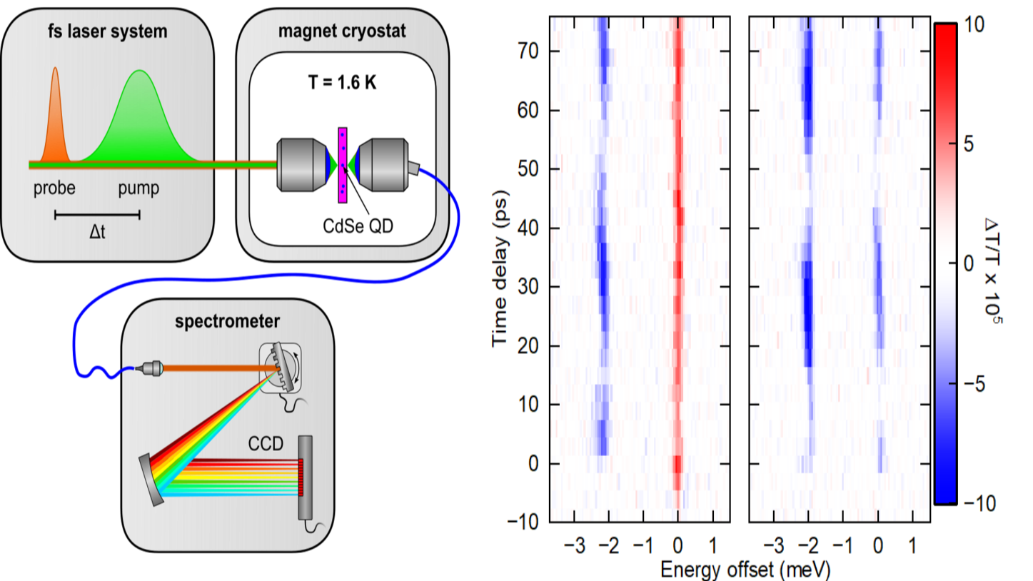 Using a highly stable femtosecond Er:fiber laser source, we generate the pump and probe beams that are focused through a high-numerical-aperture objective within an optical cryostat (T=1.6 K). Exciting well above the lowest-energy transition (
