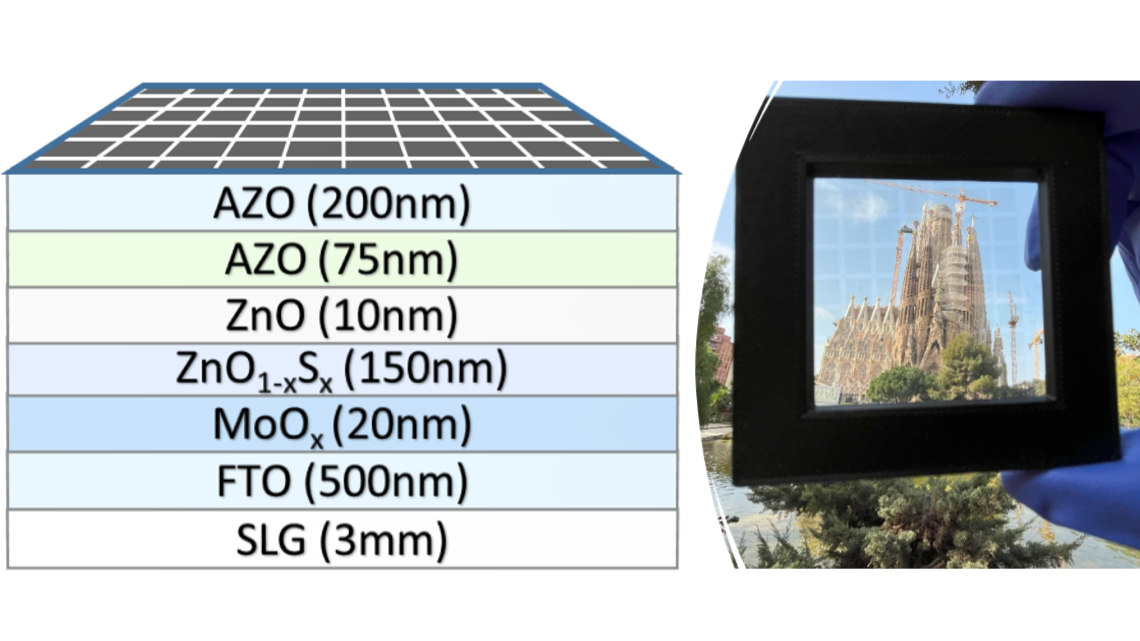 One of the most promising approaches to achieve TPV is to utilize the ultraviolet region of the solar spectra, while avoiding absorption in the visible range and more specifically on the photopic response range of the human eye, thus attaining complete apparent transparency. One promising approach to achieve high transparency on solar cells is by using wide bandgap materials with bandgap energy (Eg) above 2.7 eV. However, the choice of absorber material is critical, due to the lower number of photons in this spectral region, making it a must to have a good spectral match with the bandgap and the UV onset to maximize photon absorption. In this way, ZnO1-xSx has been proposed as an ideal UV absorber thanks to a composition-tunable bandgap that can shift from 3.2 eV (pure ZnO) down to 2.7 eV (x=0.5) by anionic substitution of oxygen by sulfur. ZnO1-xSx is a material composed of earth-abundant raw elements, compatible with scalable fabrication processes and can be synthesized at low temperatures, which potentially allows minimizing the carbon footprint, economic costs and energy expenditure associated with device manufacturing.