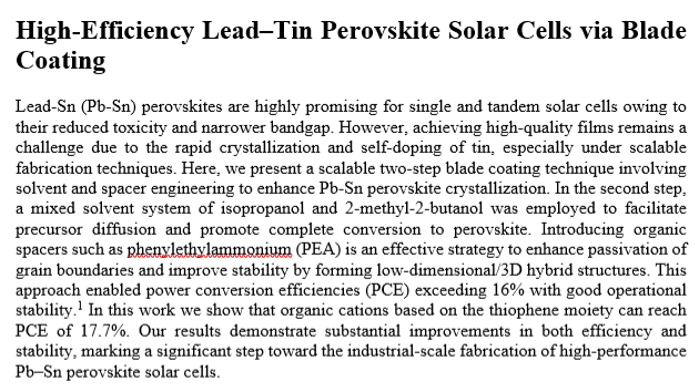Lead-Sn (Pb-Sn) perovskites are highly promising for single and tandem solar cells owing to their reduced toxicity and narrower bandgap. However, achieving high-quality films remains a challenge due to the rapid crystallization and self-doping of tin, especially under scalable fabrication techniques. Here, we present a scalable two-step blade coating technique involving solvent and spacer engineering to enhance Pb-Sn perovskite crystallization. In the second step, a mixed solvent system of isopropanol and 2-methyl-2-butanol was employed to facilitate precursor diffusion and promote complete conversion to perovskite. Introducing organic spacers such as phenylethylammonium (PEA) is an effective strategy to enhance passivation of grain boundaries and improve stability by forming low-dimensional/3D hybrid structures. This approach enabled power conversion efficiencies (PCE) exceeding 16% with good operational stability.[1] In this work we show that organic cations based on the thiophene moiety can reach PCE of 17.7%. Our results demonstrate substantial improvements in both efficiency and stability, marking a significant step toward the industrial-scale fabrication of high-performance Pb–Sn perovskite solar cells.