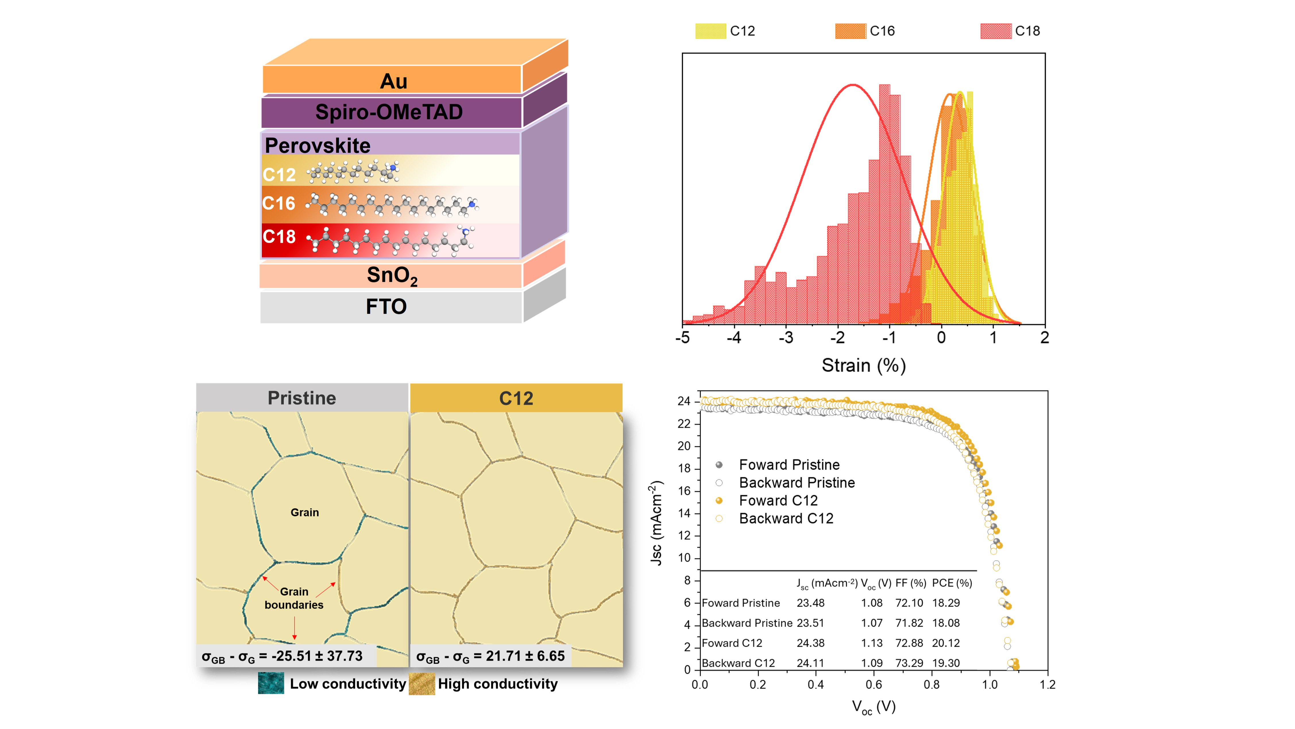 Metal halide perovskites incorporating bulky two-dimensional (2D) alkylammonium cations have recently gained attention as a promising route to combine structural stability with outstanding optoelectronic performance in solar cells. In this work, we systematically explored the incorporation of alkylammonium iodides with different chain lengths—dodecylammonium (C12), hexadecylammonium (C16), and octadecylammonium (C18)—into the bulk of perovskite films to understand how these molecules influence film formation and device efficiency. Through advanced spectroscopic, microscopic, and nanoscale mapping techniques, we observed their effects on crystallization dynamics, defect passivation, and charge transport. Among the different chain lengths, C12 emerged as the most effective in striking a balance between lattice expansion and efficient crystal growth, leading to films with enhanced [111] crystal orientation, suppressed nonradiative recombination, uniform cation distribution, and significantly improved vertical conductivity. Nanoscale X-ray diffraction revealed how the introduction of these cations alters lattice spacing and orientation, while AFM-based infrared spectroscopy confirmed effective interfacial passivation without compromising crystal quality. These combined improvements translated directly into superior device performance, with C12-modified perovskite solar cells reaching power conversion efficiencies above 20%, surpassing both pristine films and those modified with longer-chain cations, which suffered from hindered charge transport and less favorable morphologies. Beyond efficiency, the incorporation of C12 also contributed to improved operational stability, reinforcing its promise for practical applications. Altogether, our findings highlight chain-length engineering as a powerful molecular design strategy to direct crystallization, tune structural properties, and optimize optoelectronic behavior. More broadly, this work offers valuable insights for researchers aiming to design more stable, efficient, and scalable perovskite materials, helping move the technology closer to real-world renewable energy solutions.