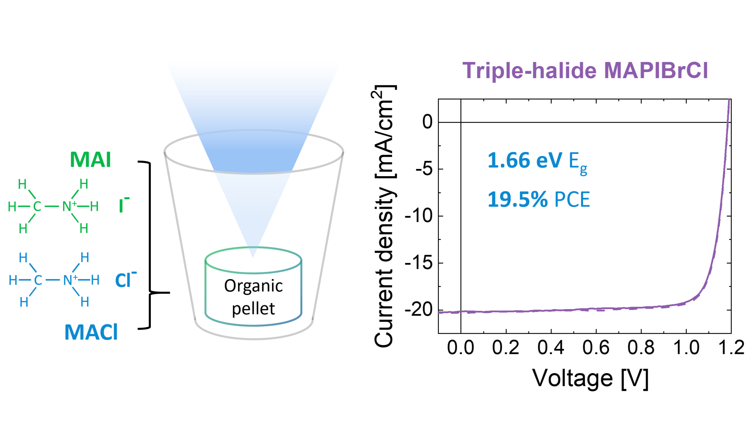 In this work we present a novel approach to sublime organic materials by pressing the precursor powder into a pellet. We observe that using a pellet leads to a lower material consumption as well as a lower pressure inside the chamber during the initial heating stage. Additionally, the pellet can incorporate multiple organic compounds, allowing the simultaneous sublimation of methylammonium iodide and chloride (MAI and MACl) without the requirement of an extra source. We use this pellet alongside a Pb(I1-xBrx)2 source to deposit a triple-halide MAPIBrCl perovskite with different amount of chloride, determined by the MACl proportion in the pellet. The inclusion of chloride in the perovskite lattice is confirmed by photoluminescence, X-ray diffraction and X-ray fluorescence measurements, in contraste with other reports where MACl helps the crystallization stage of the film but leaves during annealing. Adding chloride proves to be beneficial for the charge transport properties of the film, which translates to a higher fill factor in solar cells. As such, a champion power conversion efficiency of 19.5% was obtained for a 1.66 eV bandgap perovskite.