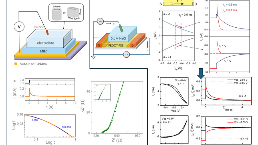 Building on this foundation, we investigated organic electrochemical transistors (OECTs) and experimentally validated the diffusion–transport model proposed by Bisquert and Tessler. For the first time, all four classes of transient responses predicted by the model—positive/negative spikes and monotonic decays—are observed and mapped across bias conditions. Drain- and gate-current analyses consistently yield the ionic diffusion time τd, confirming the model’s predictive power in real devices.
