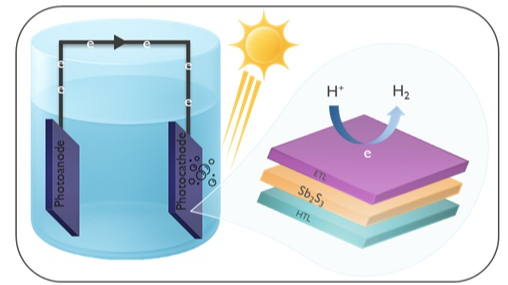 The development of efficient, stable, and scalable photocathodes is a central challenge in the advancement of solar-driven hydrogen production. Antimony trisulfide (Sb2S3) has emerged as a highly attractive candidate due to its earth abundance, suitable bandgap (~1.7 eV), high absorption coefficient, and intrinsic photostability. However, its application as a photocathode is hindered by intrinsic bulk defects, non-radiative recombination, inherently poor electron–hole separation, and instability in aqueous environments, leading to low photocurrent densities and limited operational lifetimes. In this work, we report a systematic study on the structural improvement and interfacial engineering of Sb2S3-based photocathodes, fabricated via thermal evaporation, to enhance their performance for photoelectrochemical (PEC) hydrogen generation. We systematically explored a wide range of annealing temperatures and seed layers to optimize the preferred orientation, thereby enhancing charge transport. In addition, various electron and hole transport layers were investigated to improve charge extraction and achieve better band alignment with Sb₂S₃. Notably, the incorporation of zinc oxysulfate (ZnOS) facilitated favorable band bending at the Sb₂S₃ interface, which significantly enhanced charge transport. Material and interface characterization was performed using X-ray diffraction (XRD), scanning electron microscopy (SEM), and steady-state photoluminescence (PL) spectroscopy. XRD confirmed the orthorhombic phase of Sb2S3 with high crystallinity and preferred orientation in hk1, while SEM revealed uniform film morphology with no visible pinholes or large-scale defects. PL quenching observed in the presence of ZnOS provided evidence of enhanced interfacial charge transfer and reduced recombination rates. The optimized device architecture, evaluated in a three-electrode PEC configuration, delivered a photocurrent density nearly an order of magnitude higher than that of bare Sb₂S₃ at −0.3 V vs. RHE under standard AM 1.5G illumination. Furthermore, stability testing in a neutral aqueous electrolyte (pH ~7) confirmed the robustness of the interfacial design and the chemical durability of the photoelectrode stack. These findings demonstrate that interfacial and catalytic optimization can unlock the full potential of Sb2S3 photocathodes, offering a scalable pathway toward efficient and durable chalcogenide-based systems for solar fuel generation.