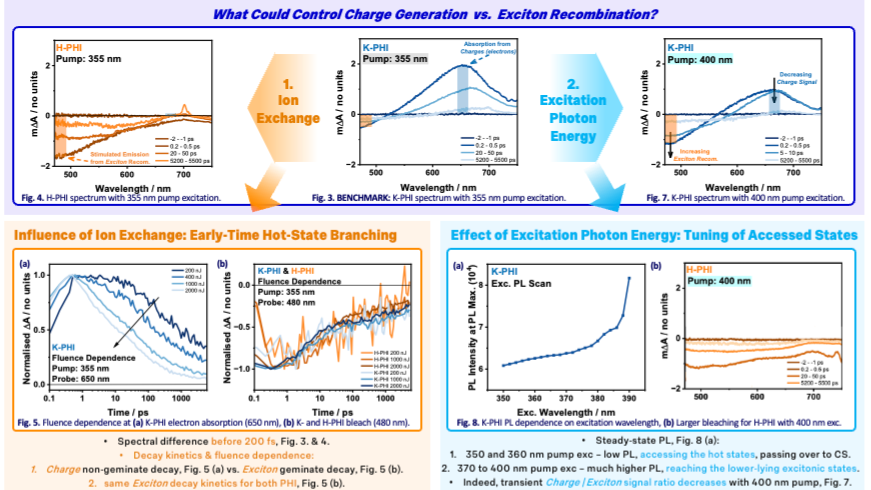 Using ultrafast transient absorption spectroscopy, we show that substituting K⁺ with H⁺ effectively quenches the charge generation pathway, suppressing the formation of long-lived electrons associated with hot-state separation. Instead, the photoexcited population is funnelled predominantly into bound excitonic states, as evidenced by strong bleach signals arising from radiative recombination. Crucially, we demonstrate that these competing photophysical pathways originate not from a sequential exciton dissociation process, but rather from a rapid branching between hot charge-generating states and lower-energy excitonic states—well before the time resolution of our measurements. These distinct regions of the electronic manifold are selectively accessed by further tuning the excitation photon energy (355-400 nm), as evidenced by the increased bleach-to-charge signal ratio in K-PHI at lower photon energies.