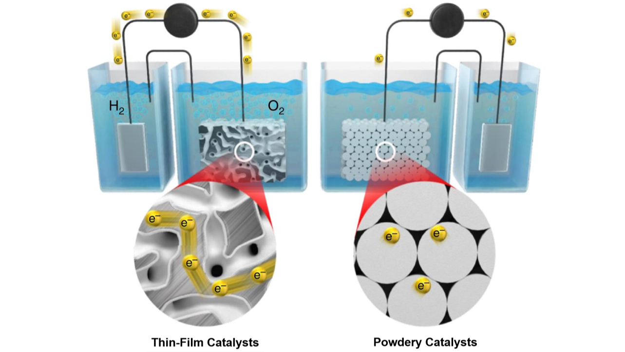 Proton exchange membrane water electrolyzers (PEMWEs) are a promising technology for the advancement of the hydrogen economy. However, critical challenges remain for oxygen evolution catalysts (electrodes) at the anode of PEMWEs, including: (1) high overpotential caused by the complex electron transport mechanisms in the oxygen evolution reaction (OER), (2) severe catalyst dissolution and component deterioration under highly acidic and oxidative OER conditions, and (3) significant interfacial resistance in conventional powdery materials and Ohmic losses during high current density operations. Herein, I propose nanoporous Ir-based alloy thin-film oxygen evolution catalysts (electrodes) with a high electrochemical active surface area, fabricated via electrochemical treatments. This approach offers several advantages: (1) facile fabrication, (2) ligand effects enabled by alloying, (3) geometric effects enhanced through electrochemical treatments, and (4) improved conductivity due to efficient electron transport through the interconnected nanostructure. These findings are expected to guide the development of advanced strategies for enhancing PEMWE performance and enabling the rational design of next-generation oxygen evolution catalysts (electrodes).