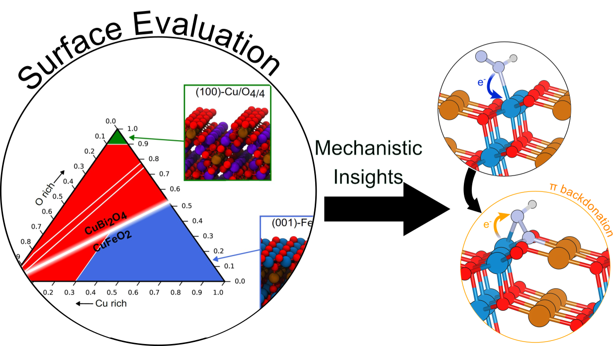 To this end, the ternary copper oxides CuFeO2 and CuBi2O4 are investigated as materials for photocathodes as promising alternatives for the conversion of solar energy into chemical fuels.[3] In this work we performed Density Functional Theory calculations (DFT+U) to analyze their electronic properties, thermodynamic stability of different surfaces and adsorption energy trends for NRR intermediates. Beyond that, we investigated diverse defects in thermodynamically stable surfaces for both materials and their impact on the NRR mechanism.[4] Moreover, the influence of an aqueous surrounding on the stability of the surfaces and reaction intermediates thereon will be investigated using the hybrid QMMM simulation approach (SAFIRES[5]) implemented in ASE and GPAW, which to this end will be extended to be compatible with periodic surface models.