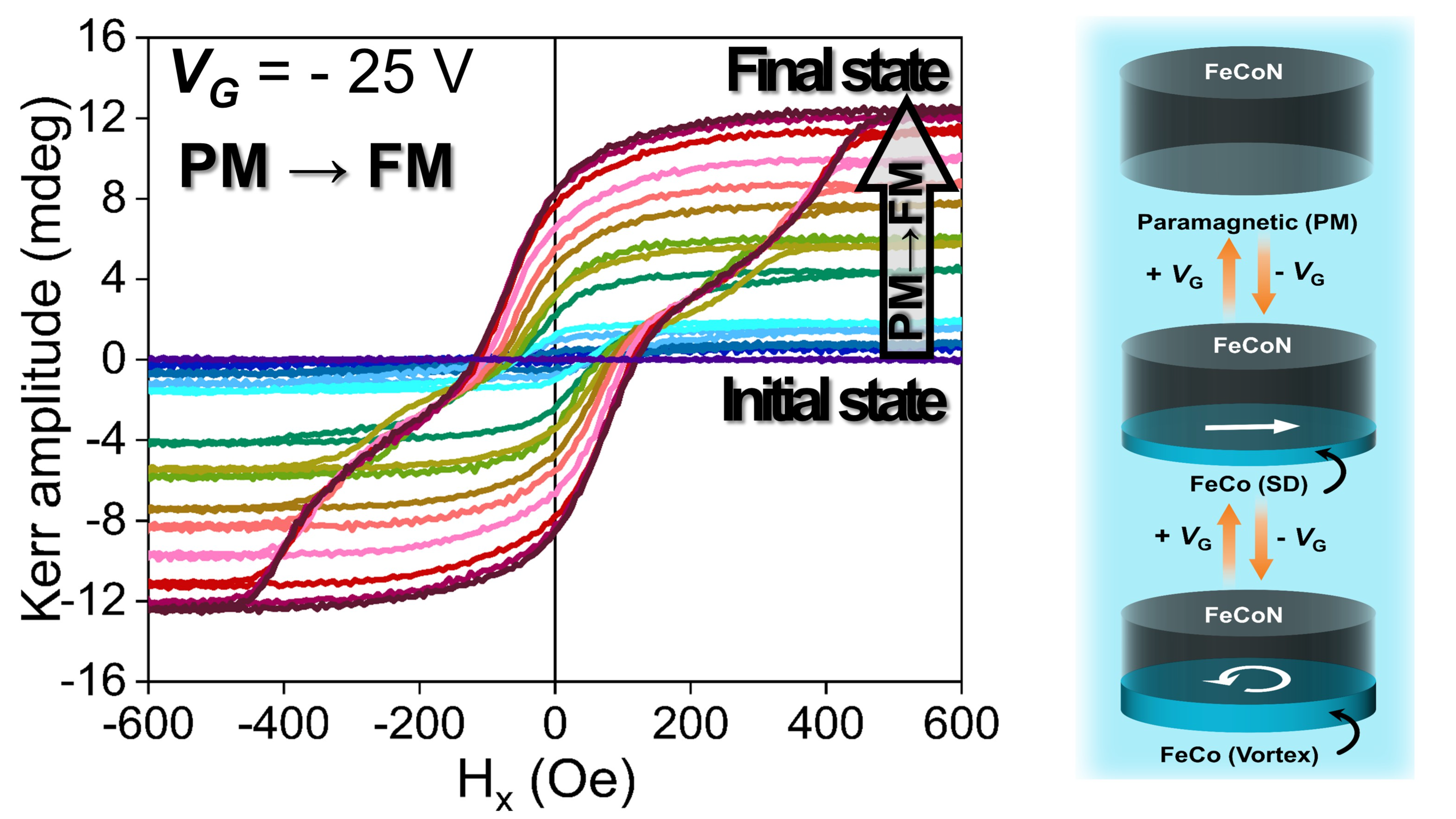 In this talk, we will demonstrate in-situ probing of magnetic properties and associated ion dynamics in nanometer-scale structures, revealing dynamically evolving spin configurations that strongly depend on the gating duration. More precisely, we will introduce a so far unexplored nanoscale magnetic object: magnetic vortex controlled by electric-field-driven ion motion, termed the magneto-ionic vortex or, for simplicity, “vortion” [6]. Vortions are generated within initially paramagnetic FeCoN nanodots via voltage-driven gradual extraction of N3– ions. What distinguishes vortions from conventional magnetic vortex states is that their key properties such as magnetization amplitude, nucleation and annihilation fields, coercivity, remanence and anisotropy, can be controlled and fine-tuned post-synthesis in an analog, reversible and energy-efficient manner [6]. This obviates the need for energy-demanding methods like laser pulses or spin-torque currents. Such tunability is made possible by taking advantage of a so far overlooked aspect of N3– magneto-ionics, namely the occurrence of a planar ion migration front, which allows precise, post-synthesis control of the magnetic layer's thickness. Consequently, we demonstrate voltage-mediated transitions between paramagnetic, single-domain, and vortion states, unlocking a new paradigm for energy-efficient control of magnetism at the nanoscale.