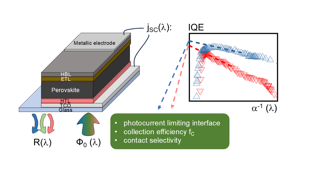Here, we introduce a broadly applicable analytical framework to extract spatially resolved charge-collection information from standard internal quantum efficiency (IQE) spectra, without assuming ideal contacts or diffusion-dominated transport. By analyzing the limiting regimes of strong and weak light absorption, we linearize the IQE with respect to the absorption coefficient, enabling direct extraction of physically meaningful quantities: the collection efficiency at the illuminated interface fC(0) and the average collection efficiency across the bulk absorber 〈fC〉. We demonstrate the approach experimentally using perovskite devices with and without an electron-transport layer, resolving contact-selectivity limitations and quantifying JSC penalties. The reconstructed IQE spectrum closely matches experimental data, validating the methodology [3].
