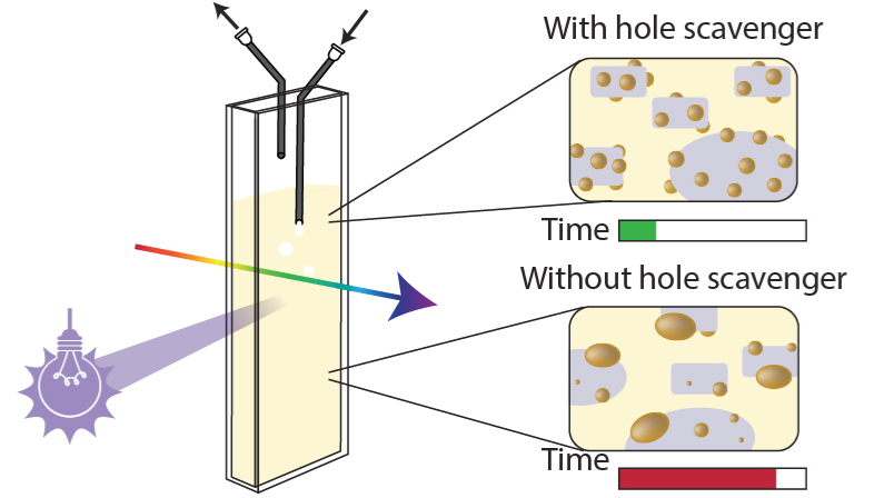 Ex-situ High-Resolution (Scanning) Transmission Electron Microscopy combined with Energy Dispersive X-ray spectroscopy (HR-(S)TEM-EDX) results show that without a hole scavenger, a broad particle size and shape distribution (20 ± 15 nm) and less nucleation sites are obtained. The optical response of Au NPs prepared without a hole scavenger show two Au Localized Surface Plasmon Resonance (LSPR) peaks, one located at ~ 515 nm and one at ~ 575 nm. From electromagnetic simulations we suspect that the LSPR peak at ~ 515 nm arises due to smaller, low-aspect-ratio NPs, whereas the LSPR peak at ~ 575 nm is due to a few large NPs with a high aspect ratio. In contrast, the use of different alcohol-based scavengers results in a uniform spatial distribution of monodisperse NP sizes of 9 ± 3 nm, leading to a well-defined Au LSPR peak centered at ~ 540 nm. Unique in-situ UV-Vis spectroscopy measurements reveal the formation of an adsorbed intermediate of Au on ZnO under dark equilibrium conditions, which reacts upon UV irradiation. These measurements also show that the photodeposition of Au on ZnO in the presence of ethanol as a hole scavenger leads to a faster nucleation and substantially accelerates particle growth compared to the non-scavenged case.