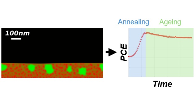 The efficiency and stability of organic solar cells (OSC) is strongly affected by the morphology of the photoactive layers, whose separated crystalline and/or amorphous phases are kinetically quenched far from their thermodynamic equilibrium during the production process. The formation of these structures and their evolution during the lifetime of the cell remains poorly understood.
