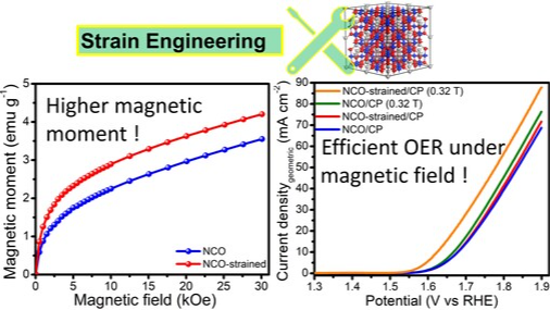 Improvement of the efficiency and cost-effectiveness of the oxygen evolution reaction (OER) remains a major challenge in water electrolysis due to its complex thermodynamics and sluggish four-electron kinetics, which involve generating paramagnetic O2 from diamagnetic species (H2O, OH–). Recent studies have demonstrated that tuning the magnetic state of catalysts or applying external magnetic fields can significantly impact reaction pathways in spin-dependent processes. [1] In this work, we present magnetically modulated NiCo2O4 as an anode catalyst for magneto-electrocatalytic (MAG-EC) OER in alkaline media. By introducing strain into NiCo2O4 by rapid quenching in liquid nitrogen, the magnetic moment at room temperature was enhanced by ~18%. Under a low external magnetic field of 0.32 T, strained-NiCo2O4 exhibited a 12.6% decrease in overpotential at 10 mA∙cm–2, compared to only a 3% reduction for pristine NiCo2O4 under identical conditions. Additionally, strained NiCo2O4 exhibited a remarkable 125.8% enhancement in current density (geometric) at 1.68 V vs. RHE under a 0.32 T magnetic field in comparison to that obtained without applying a magnetic field. These enhancements achieved by applying a magnetic field are attributed to increased spin polarization in the ferrimagnetic catalyst arising from its strengthened magnetic moment. The results highlight a conceptual advancement in magnetically controlled electrocatalysis, demonstrating how strain engineering and magnetic-state modulation can significantly boost OER activity. The insights gained from this study may guide the future design of spin-regulated catalytic materials for a broad range of energy conversion reactions.