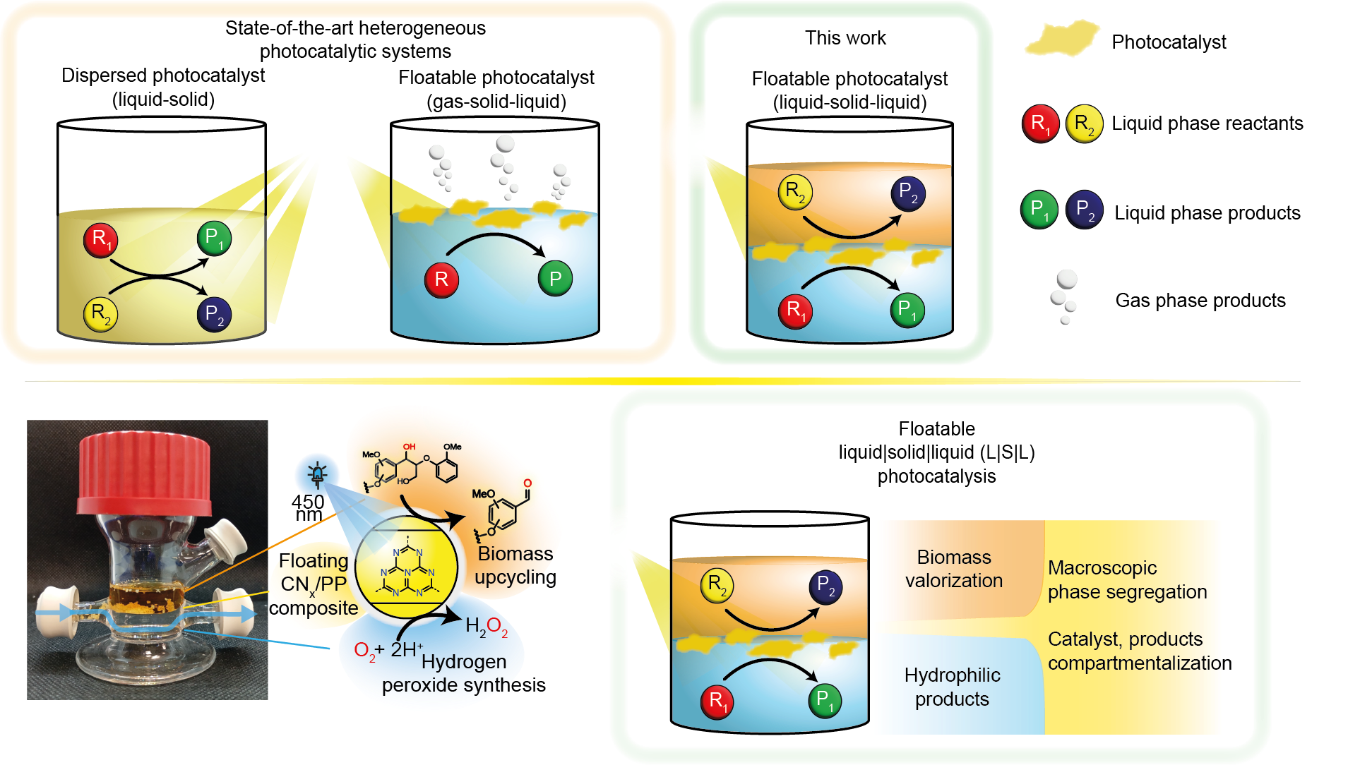 Unlike monolithic packed-bed reactors and photosheets, floatable photocatalysts offer a potential platform to compartmentalize products and charges in photoredox catalysis. While they have been shown at the gas-liquid interface, there are no reports on the segregation of liquid species. Efforts to achieve the compartmentalization of liquid phase redox reactions have been mostly inspired by biological systems,[12] using artificial synthetic and colloidal nanoreactors based on liposomal structures.[13-17]