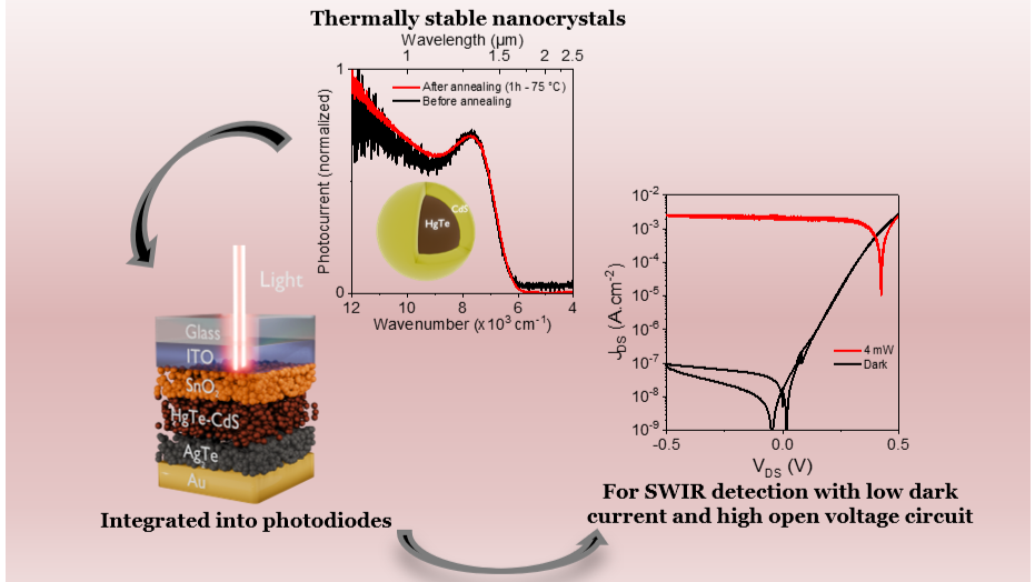 Then the material has been integrated into photodiodes for infrared detection with enhanced performances, while also optimizing the surface chemistry. The shell brings several additional benefits beyond the thermal stability such as reduced dark current and high open circuit voltage that now reaches half the optical band gap value.