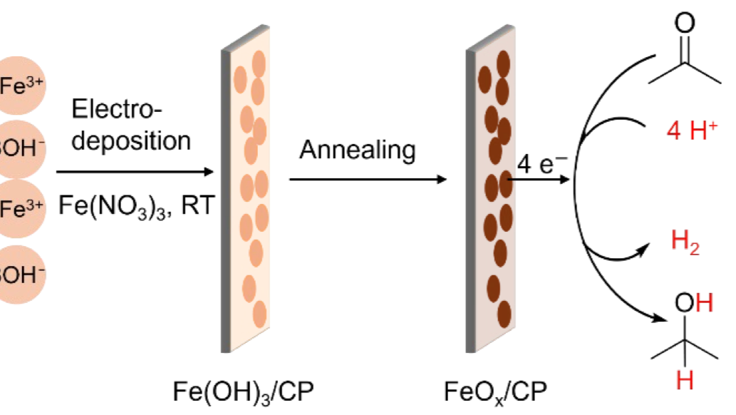 The hydrogenation of carbonyl compounds to alcohols is a fundamental transformation in synthetic chemistry with broad applications in the production of bulk and fine chemicals. Acetone hydrogenation, in particular, is gaining attention due to its relevance in isopropanol synthesis, hydrogen storage, fuel cell technologies, and mechanistic studies. In this work, we report a simple electrodeposition approach for preparing cost-effective iron oxide nanoparticles (≈70 nm) electrodes supported on carbon paper (CP). The electrocatalytic hydrogenation of acetone to isopropanol was investigated in a neutral aqueous medium (pH 7) using especially-designed H-type cell. Electrochemical results reveal that the Faradaic efficiency (FE) strongly depends on both the applied reduction potential and the electrolyte-to-acetone ratio. A maximum FE of 97% was achieved under the optimised conditions. This high performance is attributed to enhanced acetone adsorption and accelerated hydrogenation kinetics via facilitated H* formation on the iron (oxide) surface [1].