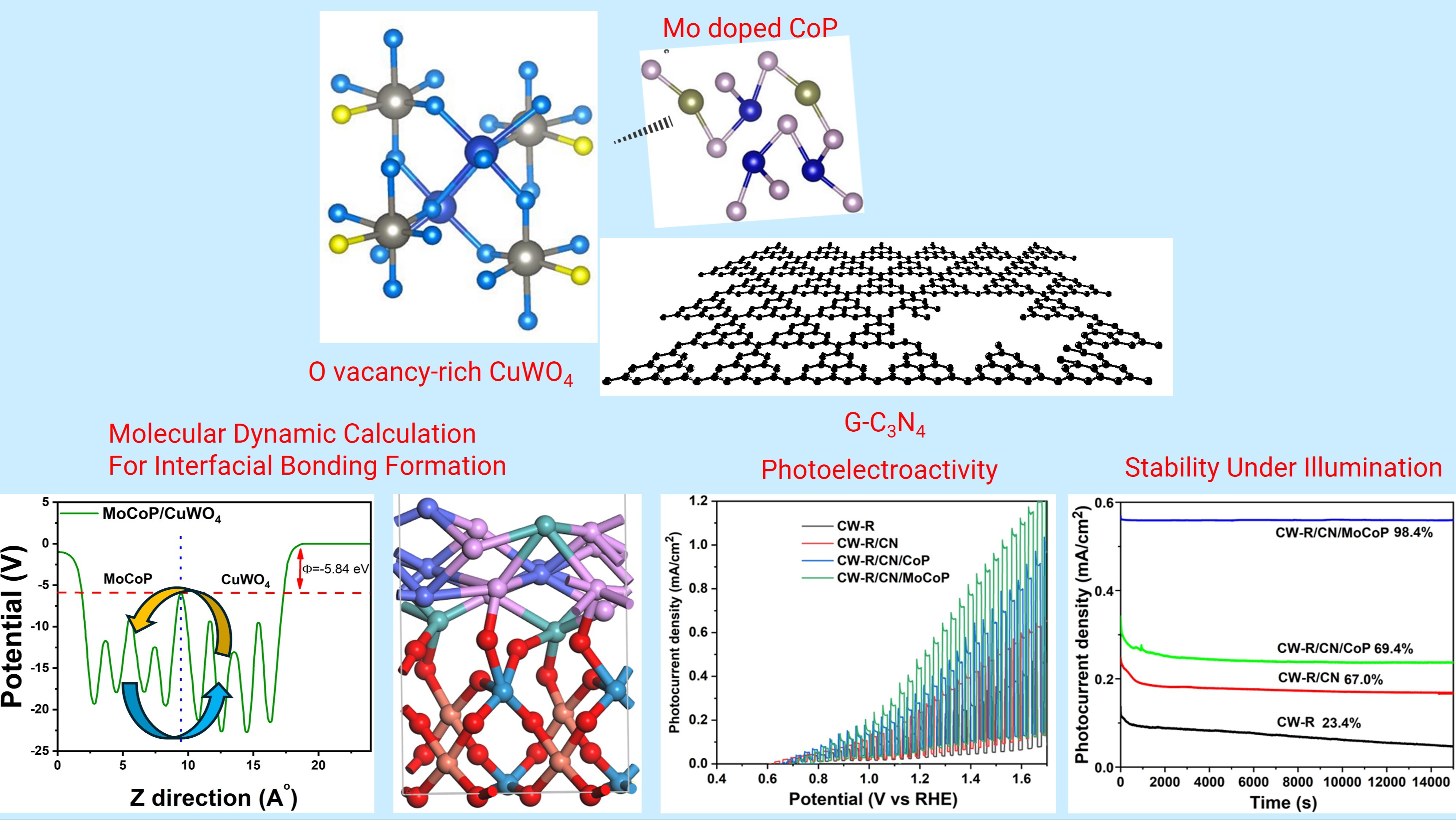 Recently, CuWO4 has garnered significant attention as an oxygen-evolution photoanode for photoelectrochemical water splitting (PEC). However, the sluggish surface oxygen evolution reaction (OER) kinetics and the photocorrosion from tungsten ion leaching remain significant challenges. Herein, we construct an oxygen-vacancy-rich CuWO4 (CW-R) photoanode bridged to a Mo-doped CoP (MoCoP) cocatalyst with bulk g-C3N4 (CN) serving as a supported material in the CN/MoCoP composite. Oxygen vacancies on CuWO4 are expected to promote interfacial W–O–Mo “bridge” bonds that both chemically anchor the cocatalyst and create atomic-level charge transfer channels, which strengthen the interfacial contact quality between cocatalyst CuWO4 and lower the interfacial carrier-transport barrier. The CW-R/CN/MoCoP photoelectrode achieves outstanding PEC performance of 0.51 mA cm-2 at 1.23 V versus the reversible hydrogen electrode (RHE), which is 3 times higher than pristine CW-R. Chronoamperometry combined with ICP-OES confirms 4-folds reduction in tungsten leaching, while gas chromatography quantifies near-steady Faradaic efficiencies (~90%). This study demonstrates the role of W–O–Mo interfacial chemical bonds, combined with a CN-supported material, as an effective interfacial design to simultaneously suppress photocorrosion and accelerate the charge extraction channel in CuWO4 photoanodes, thereby facilitating the construction of durable, high-efficiency PEC water splitting devices.