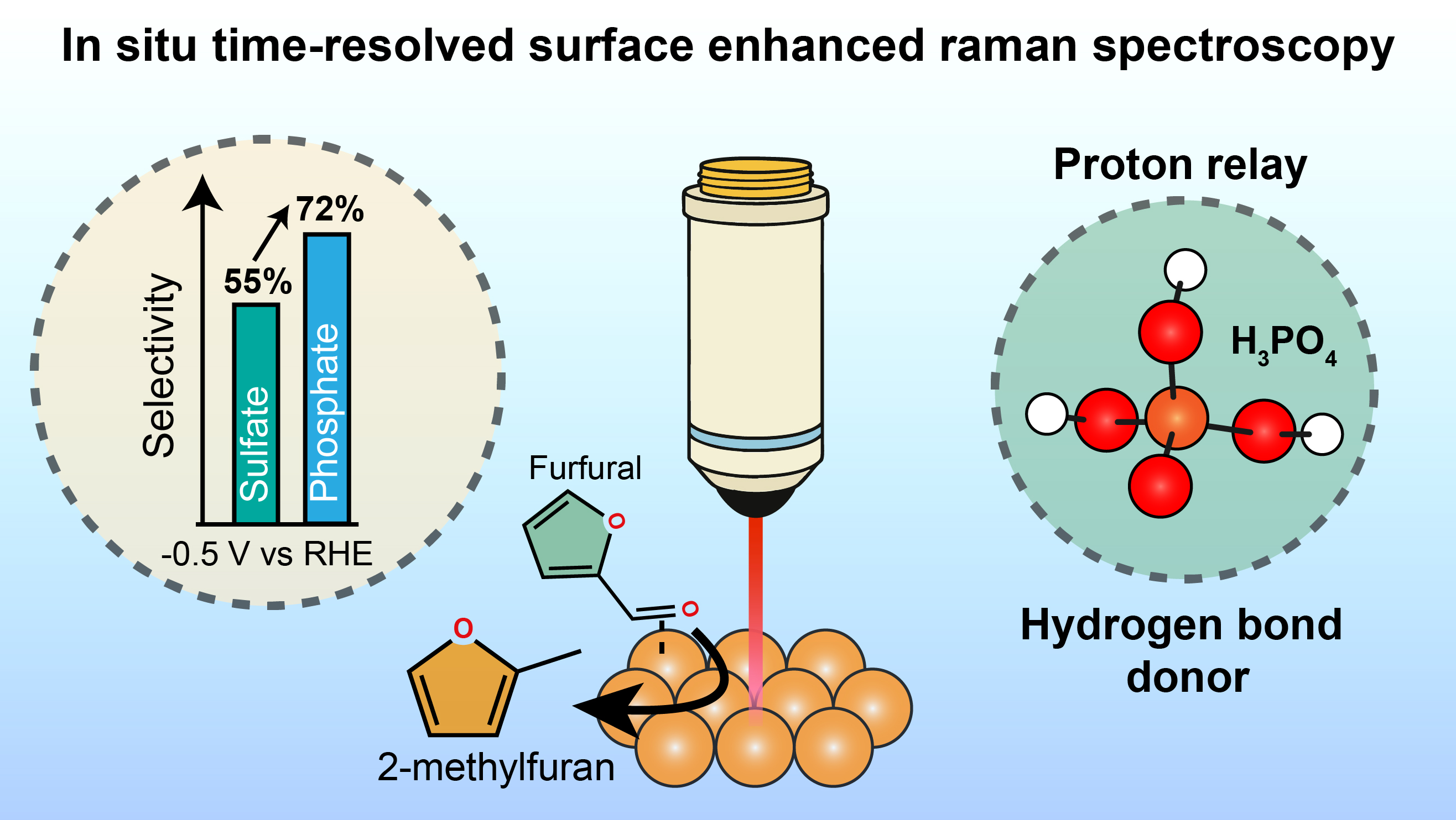 To examine the interplay between anions and the observed selectivity change, we utilized time-resolved in-situ surface-enhanced Raman spectroscopy (TR-SERS). In 0.5 M KH2PO4 + 40 mM furfural (pH 2) and at open-circuit potential (OCP), a stronger redshift of the adsorbed carbonyl bond was observed in comparison to the same experiment in sulfate. We associated this shift with a stronger interaction of phosphate anions with furfural through hydrogen bonding. Upon the application of cathodic potentials, a local increase in pH was linked to the proton donor behavior of phosphate. We posit those interactions allow for an enhanced cleavage rate of the C=O bond under operating conditions, resulting in selectivity toward 2MF comparable to state-of-the-art results.
