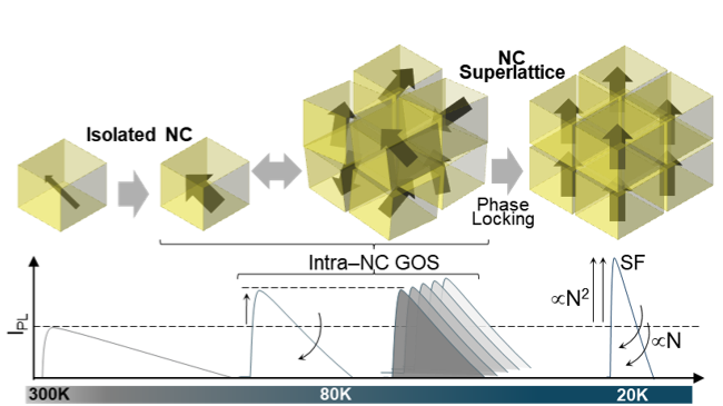 Our platform consists of highly monodisperse CsPbBr3 NCs self-assembled into long-range ordered SLs, forming large continuous domains with orientational locking and electronic coherence across many dots. Structural characterization by transmission electron microscopy and electron diffraction confirms the cubic NC lattice and the mesoscale order required for cooperative light-matter coupling. We first establish the emergence of SF under optical excitation through ps-fast streak camera measurements, observing the delayed build-up of a narrow, red-shifted emission band whose intensity and lifetime follow the expected fluence- and temperature-dependent cooperative scaling. These signatures confirm that the SLs support macroscopic polarization and collective radiative decay over coherence volumes encompassing many NCs.