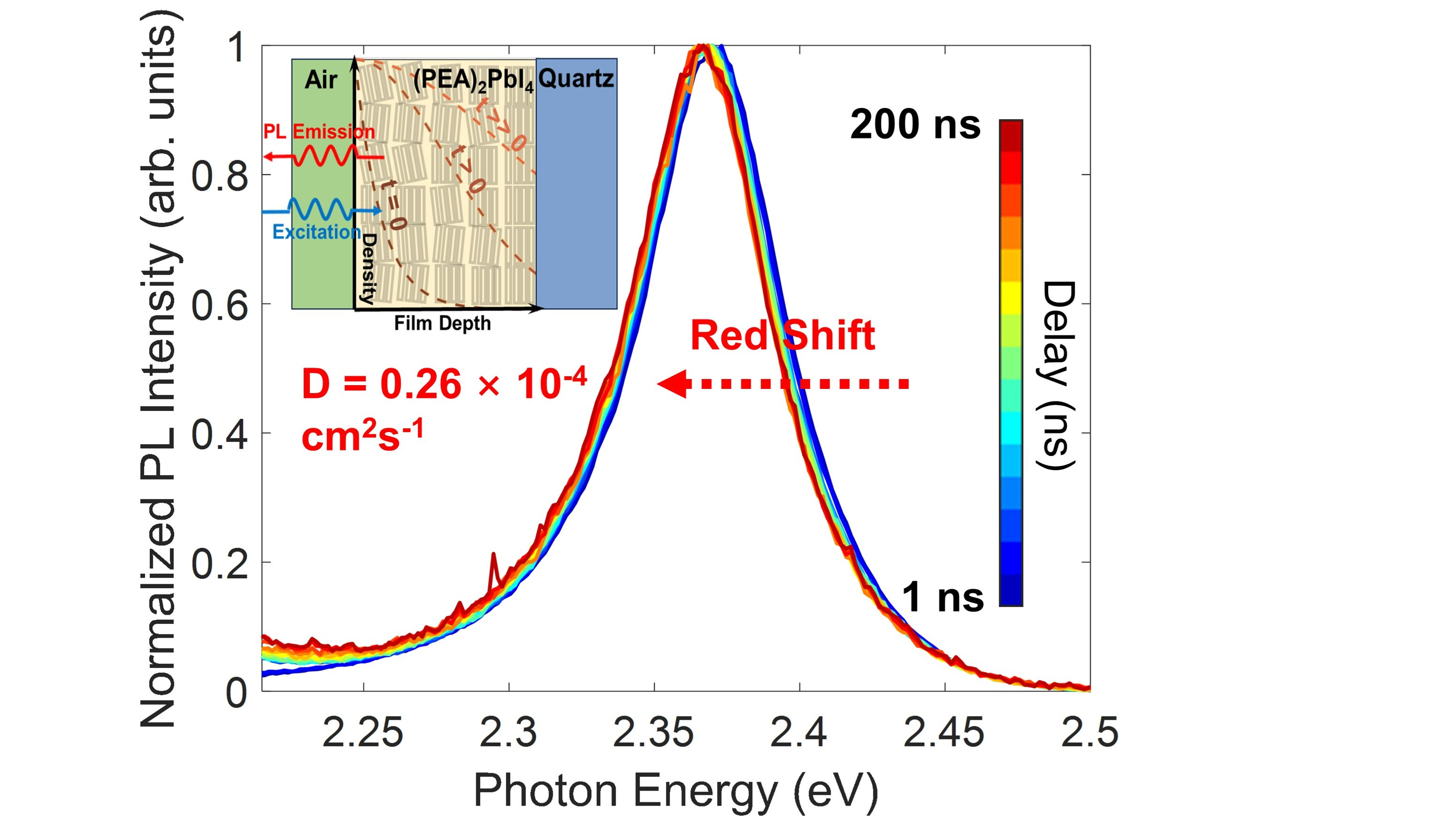 Two-dimensional lead halide perovskites (2DPs) offer chemical compatibility with three-dimensional perovskites and enhanced stability, which are attractive for applications in photovoltaic and light-emitting devices[1-2]. However, such lowered structural dimensionality causes increased excitonic effects and highly anisotropic charge-carrier transport[3-4]. Determining the diffusivity of excitations, in particular for out-of-plane or inter-layer transport, is therefore crucial, yet challenging to achieve. Here, we demonstrate an effective method for monitoring inter-layer diffusion of photoexcitations in (PEA)2PbI4 thin films by tracking time-dependent changes in photoluminescence spectra induced by photon reabsorption effects.[5] Through selective photoexcitation from either substrate- or air-side of the films we reveal differences in diffusion dynamics encountered through the film profile. We extract time-dependent diffusion coefficients from spectral dynamics through a one-dimensional diffusion model coupled with an interference correction for refractive index variations arising from the strong excitonic resonance of 2DPs.[5] Such analysis, together with structural probes, shows that minute misalignment of 2DPs planes occurs at distances far from the substrate, where efficient in-plane transport consequently overshadows the less efficient out-of-plane transport in the direction perpendicular to the substrate. Through detailed analysis, we determine a low out-of-plane excitation diffusion coefficient of (0.26 ± 0.03) × 10-4 cm2s-1, consistent with a diffusion anisotropy of ~4 orders of magnitude[5].