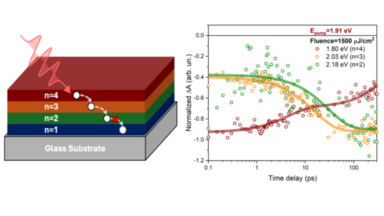 The charge dynamics and transfer processes in thin films of mixed-dimensional quasi-2D MAPI-based perovskites will be presented. By combining femtosecond transient absorption spectroscopy (FTAS) and photoluminescence (PL), the role of specific n-phases in the charge transfer dynamics will be discussed in the light of the correlation between the phase distribution within the film and the corresponding band-alignment.[3,4] Particular attention is given to the temporal evolution of photobleaching features, which reveals charge transfer and separation between higher- and lower-dimensional phases.
