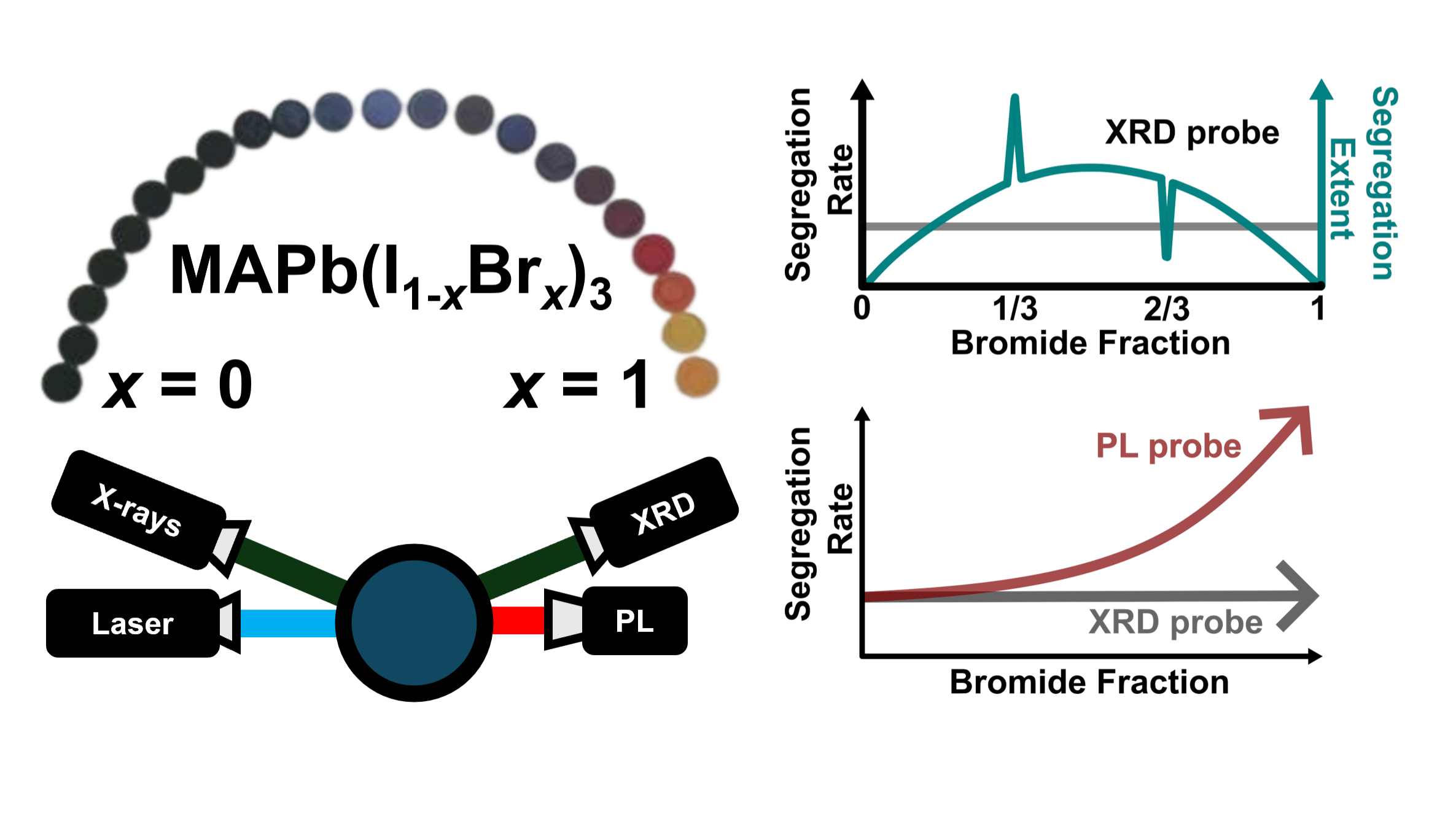 X-ray diffractometry across stoichiometries spanning twenty-two bromide fractions demonstrates that central compositions near x = 0.5 form two macrostrained phases (in the dark), which may compensate for the detrimental difference in the iodide and bromide ionic radii and cause the absence of a theoretically predicted miscibility gap.[2] Via in-situ XRD under illumination, we find that such macrostrained phases exhibit halide segregation at different rates, highlighting how initial strain engineering can modulate the speed of segregation. Alongside material strain, we provide experimental verification that halide ordering also influences segregation: CH3NH3PbIBr2 is found to exhibit exceptional segregation resistance, as theoretically predicted.[2] Combining structural and optical probes, we further demonstrate that halide segregation does still occur below the widely-quoted threshold of x equal to 0.2.
