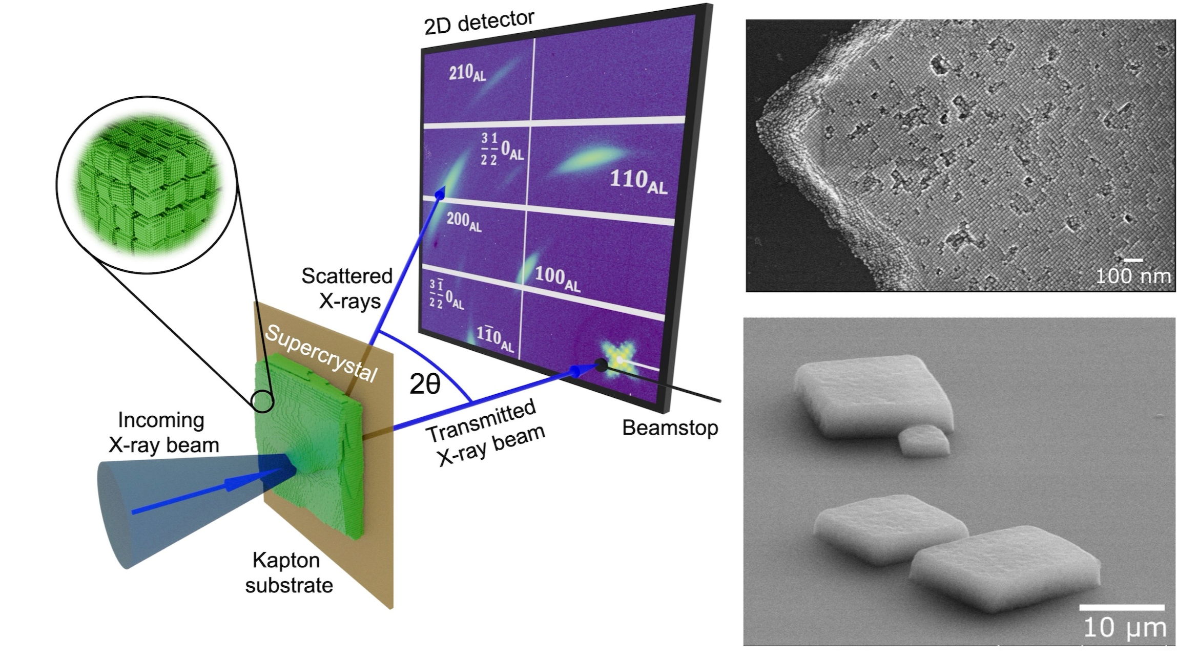 Advances in synchrotron sources and X-ray optics now make it possible to focus an X-ray beam to below 100 nm while maintaining sufficient intensity to record diffraction patterns. This enables spatially resolved characterization of these materials, providing insight into both the local superlattice structure and the atomic lattice of constituent nanocrystals [3]. Such capabilities allow direct correlation between supercrystal structure and their optical, electrical, and mechanical behavior. In this talk, we compare perovskite supercrystals synthesized via solvent-evaporation and two-layer phase-diffusion methods, highlighting how structural differences arising from these routes influence their material properties [4,5,6].