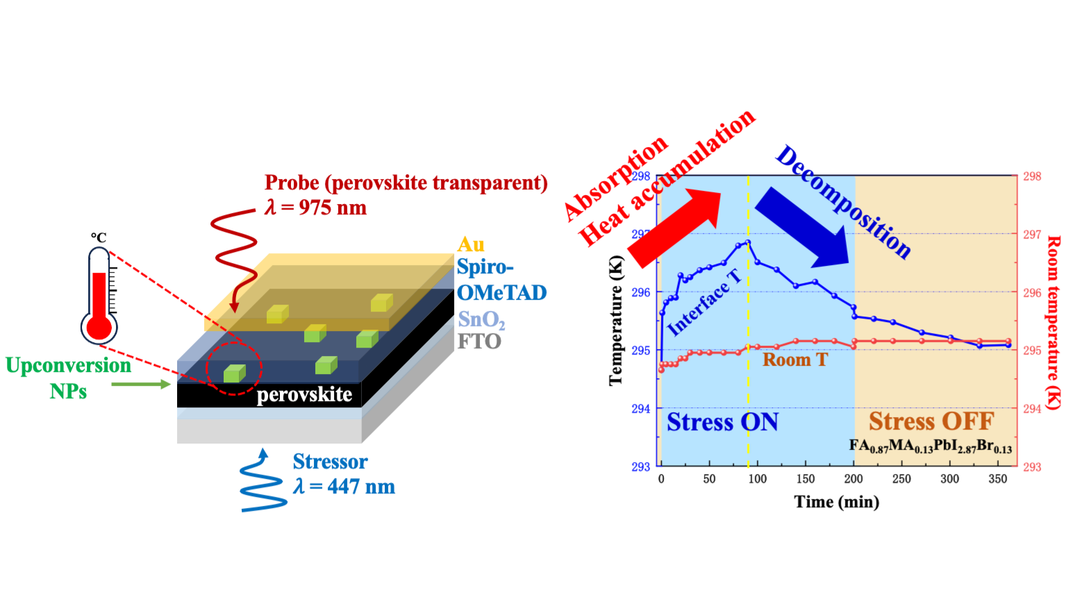 While extensive efforts have been made to understand degradation mechanisms, direct probing of the buried interfaces, where critical degradation often initiates, has remained elusive. In this work, we introduce a new in situ methodology that harnesses the nanothermometric properties of embedded upconversion fluoresent nanoparticles (UCNPs) placed at the buried perovskite/hole transport layer (HTL) interface. This approach allows, for the first time, real-time tracking of local interfacial temperature evolution during light-induced accelerated degradation, while simultaneously monitoring the device's optical and photovoltaic performance. Applied to PSCs with different perovskite compositions, this technique reveals non-trivial thermal signatures and distinct degradation regimes correlated with structural and optical changes observed via ex situ characterizations. The results uncover a dynamic interplay between heat accumulation, phase transformation, and material decomposition, offering insights into the spatiotemporal evolution of PSC degradation.
