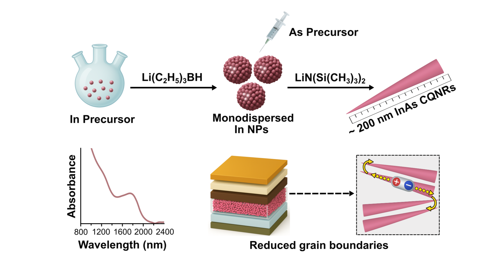 InAs colloidal quantum dots (CQDs) are promising for shortwave infrared (SWIR) optoelectronics, due to their size-tunable optical properties, compatibility with CMOS technology, and compliance with the RoHS directive. However, increasing CQD size to achieve extended SWIR (eSWIR) bandgaps and improving charge transport often compromises colloidal stability. Here, we report a growth strategy for ultra-long InAs colloidal quantum nanorods (CQNRs) that maintain quantum confinement while enhancing colloidal stability and charge transport. A key innovation is the precise chemical control through lithium bis(trimethylsilyl)amide (LiN(Si(CH3)3)2) that directly controls their anisotropic growth, enabling the synthesis of nanorods up to ~200 nm in length, orders of magnitude longer than previously reported for colloidal InAs. Transitioning from spherical QDs to nanorods allows size extension without inducing aggregation or precipitation. The resulting CQNRs exhibit excellent colloidal stability and absorption up to 2000 nm in the eSWIR region. Photodiodes fabricated from these CQNRs exhibit very low dark current (6 μA cm-2) and high external quantum efficiency (10.6%), attributed to reduced interparticle grain boundaries confirmed by four-dimensional scanning transmission electron microscopy. This work demonstrates the controlled growth of ultra-long, colloidally stable InAs CQNRs and provides a route to environmentally compliant large CQDs for next-generation high-performance eSWIR optoelectronic devices.