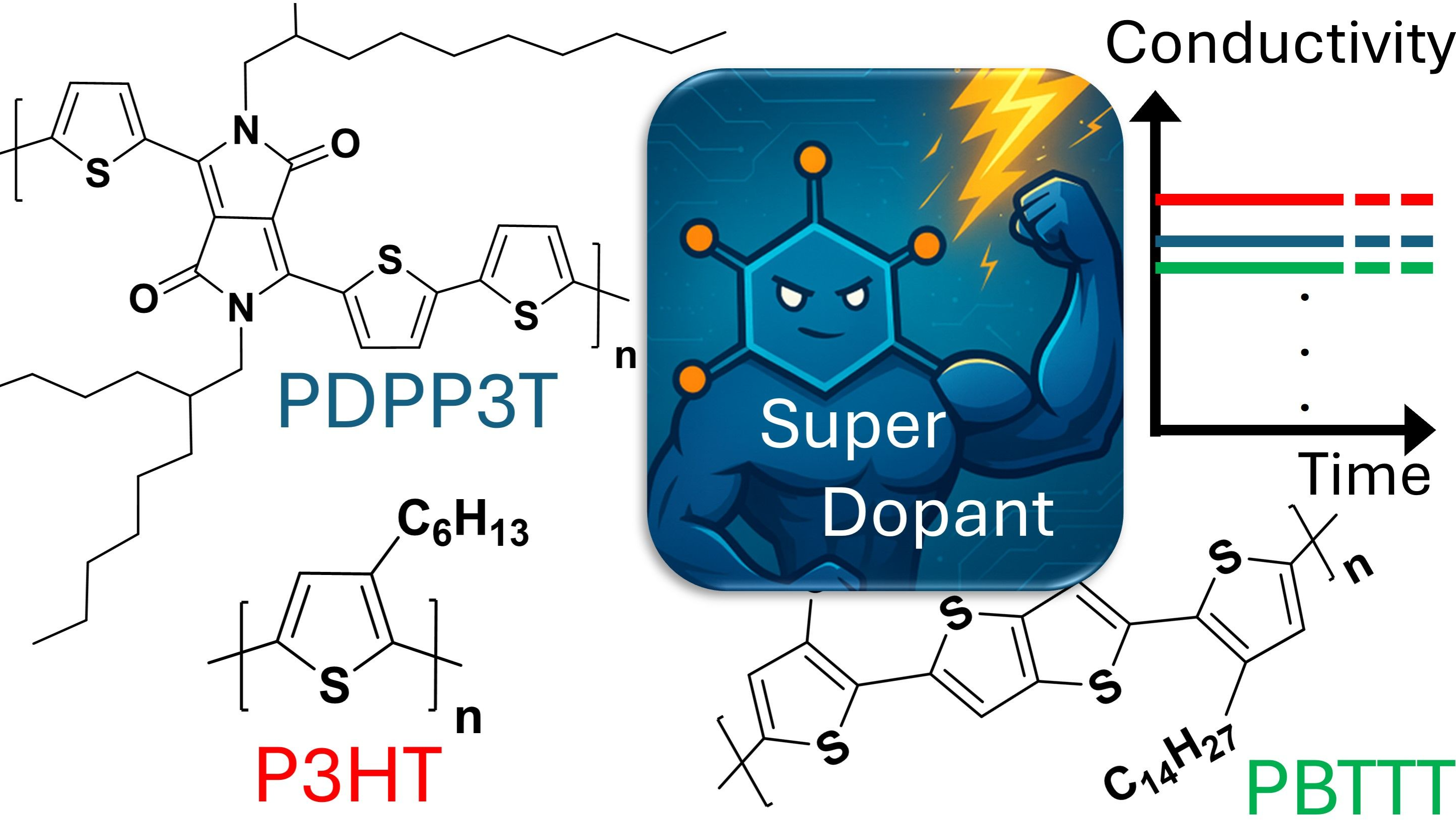 In this presentation, we introduce a doping molecule that provides higher conductivity as well as improved ambient and thermal stability compared to typical molecular dopants—and does so across many prototypical conjugated polymers. We explain the mechanism behind this universal combination of high conductivity and stability using P3HT as a benchmark, supported by Gibbs free-energy simulations of the dopant–polymer system and experimental evidence from GIWAXS (nanostructure evolution) and UV–Vis spectroscopy (doping-state evolution over time). Power factors as high as 65 μW/(m·K2) for PDPP3T and 35 μW/(m·K2) for PBTTT are achieved, remaining as high as 40 μW/(m·K2) and 15 μW/(m·K2), respectively, after 25 days of storage in a glovebox. This represents an order-of-magnitude improvement in stability over state-of-the-art dopants, pointing toward the feasibility of using encapsulated, molecularly doped conjugated polymers in real thermoelectric applications.