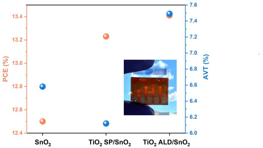 The ALD-TiO2/SnO2 ETL bilayer demonstrated enhanced AVT and PCE, and a superior light utilisation efficiency (LUE=AVT×PCE) when compared, through external quantum efficiency (EQE) and current-voltage measurements, to the most common TiO2 by spray pyrolysis (SP), also employed in a bilayer, and to the SnO2 stand-alone ETL. Indeed, the ALD-based ST-PSC showed reduced light loss in the photon balance check (EQE+Reflectance+Transmittance≤1) and increased perovskite grain size in the SEM imaging. These results suggest that the ALD-TiO2/SnO2 bilayer effectively improves, at the same time, both optical transmittance and electrical performance, paving the way for ST-PSCs with balanced AVT and PCE and thus enhanced LUE values.