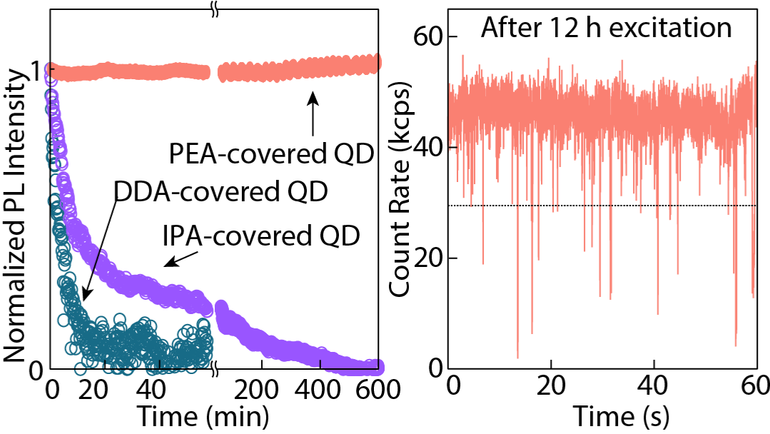 Colloidal halide perovskite quantum dots (QDs) have garnered significant attention as single-photon source materials due to their scalable synthesis, solution-processability, and high brightness. Despite extensive efforts to stabilize the surface through chemical engineering of ligand binding components, individual CsPbBr3 perovskite QDs often exhibit fluorescence intermittence (also known as “blinking”) and severe photodegradation. Here, we introduce a solid-state organic crystal passivation strategy for CsPbX3 (X=Br, I) perovskite QDs with sizes ranging from 3.6 to 14 nm. By leveraging the low steric hindrance of phenethylammonium ligands and their attractive intermolecular interactions, we promote the epitaxial ligand crystallization on the surface of single CsPbX3 (X=Br, I) QDs. These QDs exhibit nearly non-blinking single-photon emission with high purity (~98%) and remain photostable after 12 hours of continuous operation. Single QDs can also withstand saturated laser excitation.[1] These advantages enable the determination of size-dependent exciton radiative rates and emission linewidths of CsPbBr3 QDs at the single-particle level. Additionally, we discuss the impact of the ligand molecular crystal on the optical properties of single perovskite QDs at room and cryogenic temperatures.