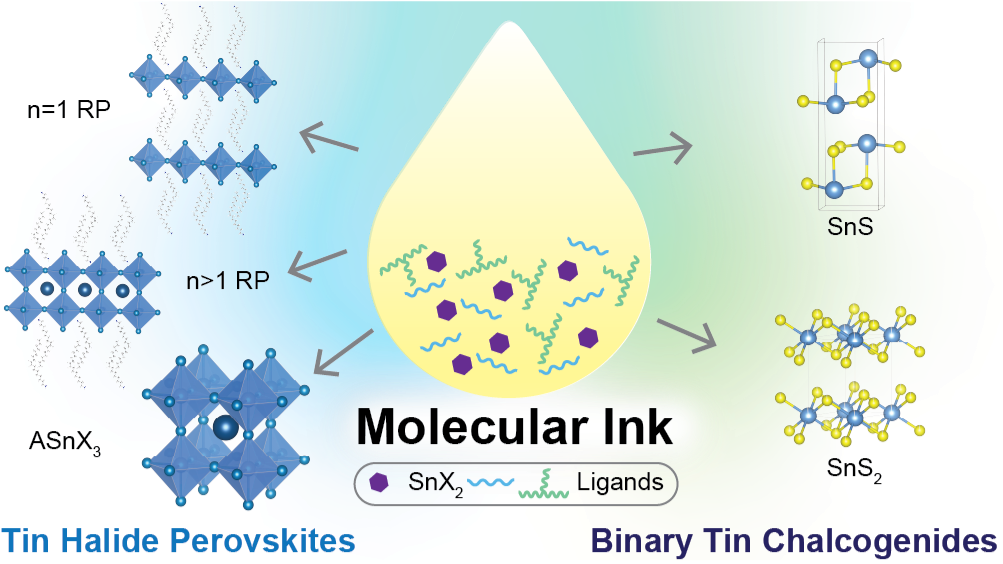 Molecular inks, composed of reactive metal complexes, offer a versatile platform for the controlled synthesis of a large library of materials. By controlling the ink composition, a large variety of perovskite nanostructures including 2D Ruddlesden-Popper phases, 3D nanocrystals and epitaxial thin films can be selectively synthesized. Focusing on tin perovskites, due to their excellent optoelectronic properties, the effect of ligand coordination in tin iodide inks was studied using UV-Vis spectroscopy and 119Sn NMR. By tuning the ink composition, the formation of 2D Ruddlesden-Popper nanostructures or 3D FASnI3 perovskite nanocrystals could be selectively controlled. In parallel, tin chalcogenide molecular inks derived from reactive tin thiolate complexes were screened as platforms for the synthesis of epitaxial tin chalcogenide perovskite thin films. By coupling 119Sn NMR of the ink solutions with XRD of the annealed inks, the relationship between the tin precursor complex and the resulting nanostructure could be elucidated. Equipped with these insights, we show how the strategic design of tin based molecular inks can be used to synthesize targeted tin perovskite nanostructures, paving the way for next generation materials.
