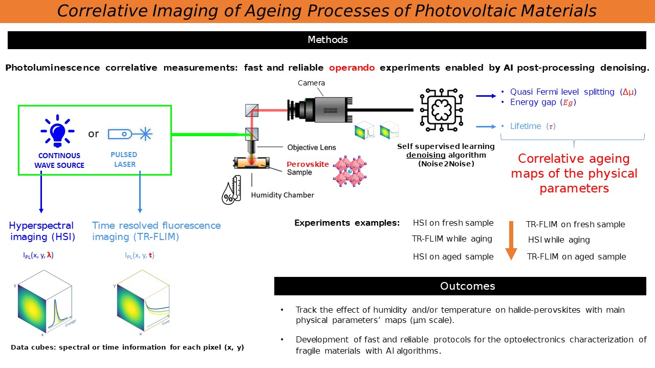 We customed a new learning image restoration Noise2Noise (N2N) algorithm [2] to denoise multidimensional datasets, in which the loss function is zero-shot trained on a physics-based model for time-resolved fluorescence imaging (TR-FLIM) [3]. The main advantage of N2N with respect to other algorithms lies in its unsupervised learning framework, which makes it particularly well-suited to complex, real-world image denoising situations when no ground truth is accessible. With this approach, we performed in-situ TR-FLIM data acquisitions on halide PVK thin films under controlled humidity or temperature conditions (RH 85% or T 65 °C). Specifically, we tested half-cells of double-cation PVK (FA0.83Cs0.17Pb(I0.83Br0.17)3) deposited by slot die, with or without self-assembled monolayer (MeO2PACz) in its bulk. Finally, having acquired hyperspectral datasets on the samples at the beginning and at the end of the aging period, we were able to correlate the quasi-Fermi level splitting (QFLS) and lifetime images over the same illuminated area, for both fresh and aged materials.
