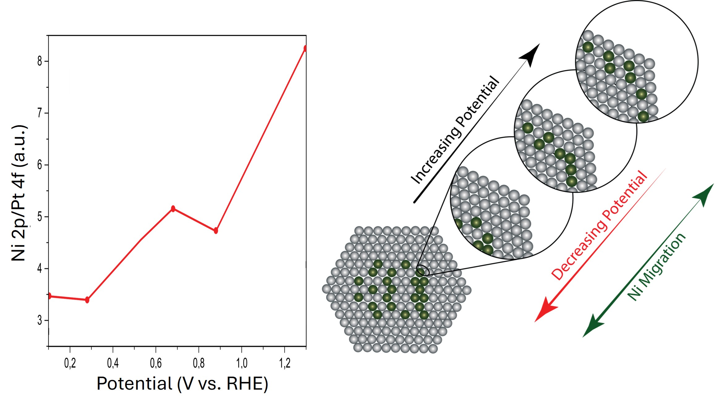 Alloying and doping are important tools to improve the activity and stability of oxygen reduction reaction (ORR) electrocatalysts. To understand the role that the doping/alloying elements play during the catalysis, revealing their interfacial electrochemical behavior is critical. Here, I will show my group’s recent efforts to obtain such insight using electrochemical X-ray photoelectron spectroscopy (EC-XPS). In EC-XPS, an electrochemical cell capped by a graphene window is used inside the vacuum of the spectroscopy chamber, facilitating in situ XPS measurements that can resolve the concentration and chemical state of the dopants at the catalyst surface. We have used this to study the potential-dependent structure of Pt3Ni, Pt9Au and N-doped graphene ORR catalysts. Our results universally show that the catalyst structure is highly dynamic. For the Pt3Ni and Pt9Au alloys, we find that the elemental distribution within the catalyst nanoparticles reversibly changes with the applied potential (see figure) [1], and that this leads to potential-dependent catalytic properties. For nitrogen-doped graphene oxygen reduction catalysts, we find a similar dynamic response in the structure around the N dopants. These examples highlight the importance of understanding the operando restructuring for multi-element catalyst design, and show how the element and depth-sensitivity of electrochemical XPS can be used to obtain such insight.
