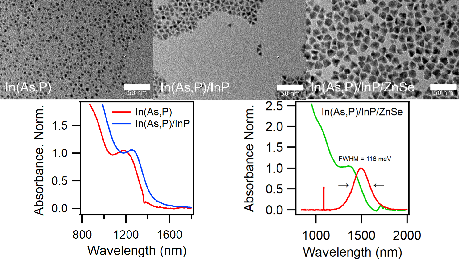 Short-wave infrared (SWIR) semiconductor materials are essential for the development of consumer optoelectronic applications such as telecommunication, sensing and biological imaging. Indium arsenide (InAs) quantum dot (QD) materials are not restricted and offer bandgap tunability throughout the whole SWIR, making them very promising for such applications. Active imaging applications such as sensing require both a SWIR source and a detector, for example a QD-light emitting diode (QLED) and a QD-photodetector (QDPD) respectively. However, because of the lack of high photoluminescence quantum yield (PLQY) InAs-based QDs, QLED development lags behind QDPD development. Strong advancements have been made for the synthesis of InAs/ZnSe core/shells to enhance PLQY of these materials in the SWIR.[1,2] However, further improvement is needed as efficiency rapidly declines with longer emission wavelengths and PL features remain broad. An appealing core/shell combination for emission at longer wavelengths is InAs/InP. InAs and InP have a common cation and a relatively small lattice mismatch, enabling the formation of a low-defect interface in core/shell structures. However, little work has been done on the development of these InAs/InP-based structures.[3,4] In this work we present work done on the In(As,P) alloy synthesis route published by Leemans et al.[5] Using amino-arsine and -phosphine for In(As,P) core synthesis gives a tunable method for particles with band-edge transition (BET) between 1150 - 1600 nm. Firstly, we present a synthesis method for In(As,P) with BET features between 1250 - 1650 nm, with FWHM as low as 90 meV. The synthesis has a chemical yield between 30 - 50 % and does not require any size-selective precipitation steps, making it more easily reproducible. However, the photoluminescence quantum yield (PLQY) of these core QDs remains low without surface treatment or shell growth (< 1%). Secondly, in this work we present a novel synthesis route for the growth of tetrahedral In(As,P)/InP core/shell structures. This synthesis enables In(As,P)/InP with variable thickness of 1 - 5 monolayers (ML) and core sizes used between 5 - 10 nm in edge length. The synthesis can be done in both 2- and 1-pot fashion. The BET is not broadened and PLQY is enhanced from << 1 % to roughly 1 %. Compared to the InAs/ZnSe materials, this is a relatively small increase. Through ab initio density functional theory calculations we can attribute this low PLQY to surface states on the InP shell. Finally, we present a synthesis route for facile ZnSe overgrowth of the In(As,P)/InP core/shell structure demonstrating luminescent materials with centre of emission between 1200 and 1550 nm. The material PLQY is between 12 - 16 % and the PL FWHM is typically between 120 and 90 meV. Again, this synthesis works both in a full 1-pot or a 2-pot fashion. These are record narrow PL features with relatively good PLQY for RoHS-compliant InAs-based QDs in the SWIR. They provide a strong material baseline for further development of QLED devices for consumer applications such as telecommunication, sensing and biological imaging.