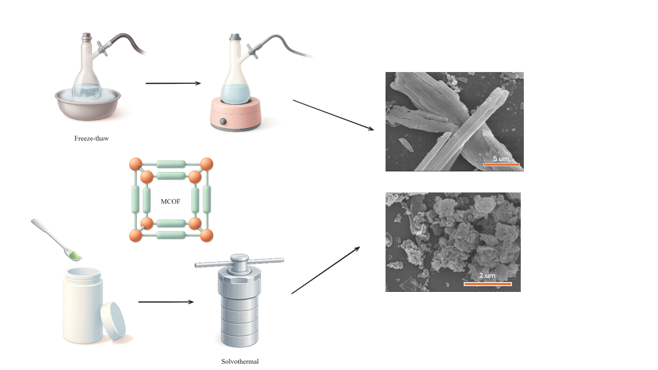 However, a better understanding of the atomic structure of MLCOFs is expected to improve their performance and design. Due to the low crystallinity of these frameworks, obtaining a complete structural understanding of MLCOFs is a challenge. Nevertheless, using a theoretical and experimental approach, MLCOFs can be fully characterised, as illustrated in a Ru(tpy)2-based MLCOF.[5] Taking inspiration from this, we have synthesised a novel MLCOF, instead using Fe(tpy)2 metalloligands and tetrasubstituted pyrene nodes. With the aim of producing a more environmentally friendly alternative, we use iron, an earth abundant transition metal. Morphological changes in response to the modulation of monomer ratios, shifting from globular to coral-like will be presented. In addition, the use of a freeze-thaw processing step, further shifts the morphology to stacked elongated sheet-like structures. A complete structural characterisation has been conducted, including crystallographic investigations using 3D electron diffraction and X-ray diffraction techniques. Prelimianry CO2 reduction tests have been carried out and the results will be presented.