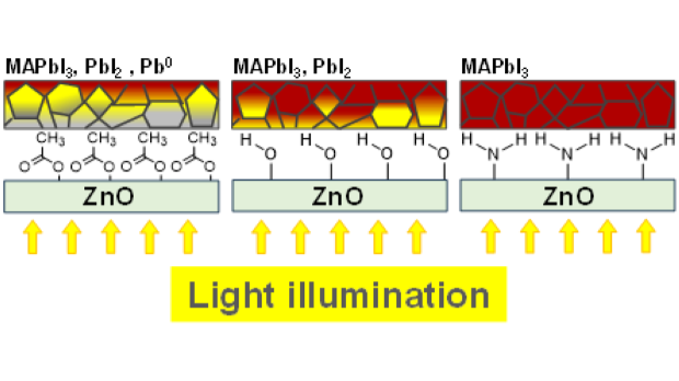 Herein, we present a comparative study of different solution-based and solution-free zinc oxide deposition methods in the context of their impact on the stability of ZnO/perovskite interface using a series of complementary experimental and computational methods. Thus, it has been revealed that the OH-terminated oxide surface induced severe degradation of all types of perovskite absorbers. The zinc oxide passivated from the surface with acetate groups was found to be very aggressive toward MAPbI3 and quite inert with respect to a methylammonium-free perovskite formulation. Most notably, the amine-passivated ZnO films induced no degradation of the perovskite absorber films, whereas the corresponding perovskite solar cells retained 70% of the initial efficiency after 2500 h of continuous operation under open circuit conditions and white light irradiation, which is an impressive result for devices with n-i-p geometry. Thus, the presented results demonstrate the power of the surface chemistry that can alter completely the behavior of the ZnO films; this approach holds a great potential for tailoring the properties of other oxide materials such as TiO2, SnO2, NiO, etc. to pave a way to efficient and stable perovskite solar cells.
