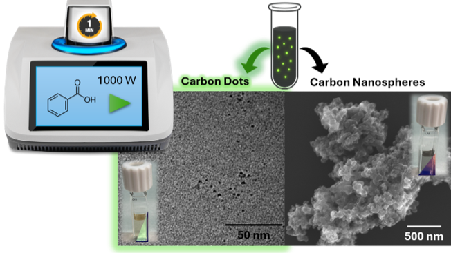 In this work, we present an ultrarapid microwave-assisted method (60 seconds) that enables the simultaneous synthesis of two distinct carbon-based nanomaterials. A specific purification procedure was developed, allowing their complete separation and revealing that each material exhibits unique physicochemical properties. Through this approach, we successfully obtained green-emissive CQDs with an average size of 7.0 ± 0.9 nm, along with non-emissive black carbon nanospheres of ca. 50 nm in diameter. To gain insight into their structural and functional behavior, an exhaustive characterization was carried out using complementary techniques, including Small-Angle X-ray Scattering (SAXS), Raman spectroscopy, Attenuated Total Reflectance – Fourier Transform Infrared Spectroscopy (ATR-FTIR), High resolution Transmission Electron Microscopy (HRTEM), X-ray Photoelectron Spectroscopy (XPS), and X-ray Diffraction (XRD). This comprehensive analysis provided a detailed understanding of the morphology, composition, and structural features of both nanomaterials. The photocatalytic activity of these materials was evaluated using as proof-of-concept the reduction of methyl viologen (MV2+) in aqueous media.