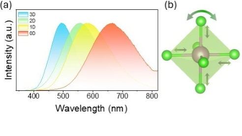 We first examine the role of structural dimensionality using a family of antimony (Sb)-doped Indium (In)-based halides that possess 0-dimensional (0D) electronic structures but feature 3D, 2D, 1D, and 0D connectivity at the molecular level. [6] As the dimensionality decreases, the broadband emission redshifts continuously from about 500 to 660 nm (Fig. 1a). Through detailed structural and spectroscopic analyses, we reveal that the distortion of [SbCl6]3- octahedra drives this tunability (Fig. 1b). We further demonstrate that solvent coordination during crystallization provides an additional handle to tailor emission: by crystallizing [SbCl6]3- frameworks from hydrochloric acid (HCl), dimethylformamide (DMF), methanol (MeOH), acetonitrile (ACN) and dimethylacetamide (DMAC). We uncover solvent-dependent structural motifs where coordinated organic molecules modulate the local metal halide structures and resulting different photoluminescence. [7] Extending these principles, we introduce a broader design strategy that couples ns2 ion doping with controlled lattice distortion to achieve tunable broadband emission spanning the UV–visible–NIR range within a single host.