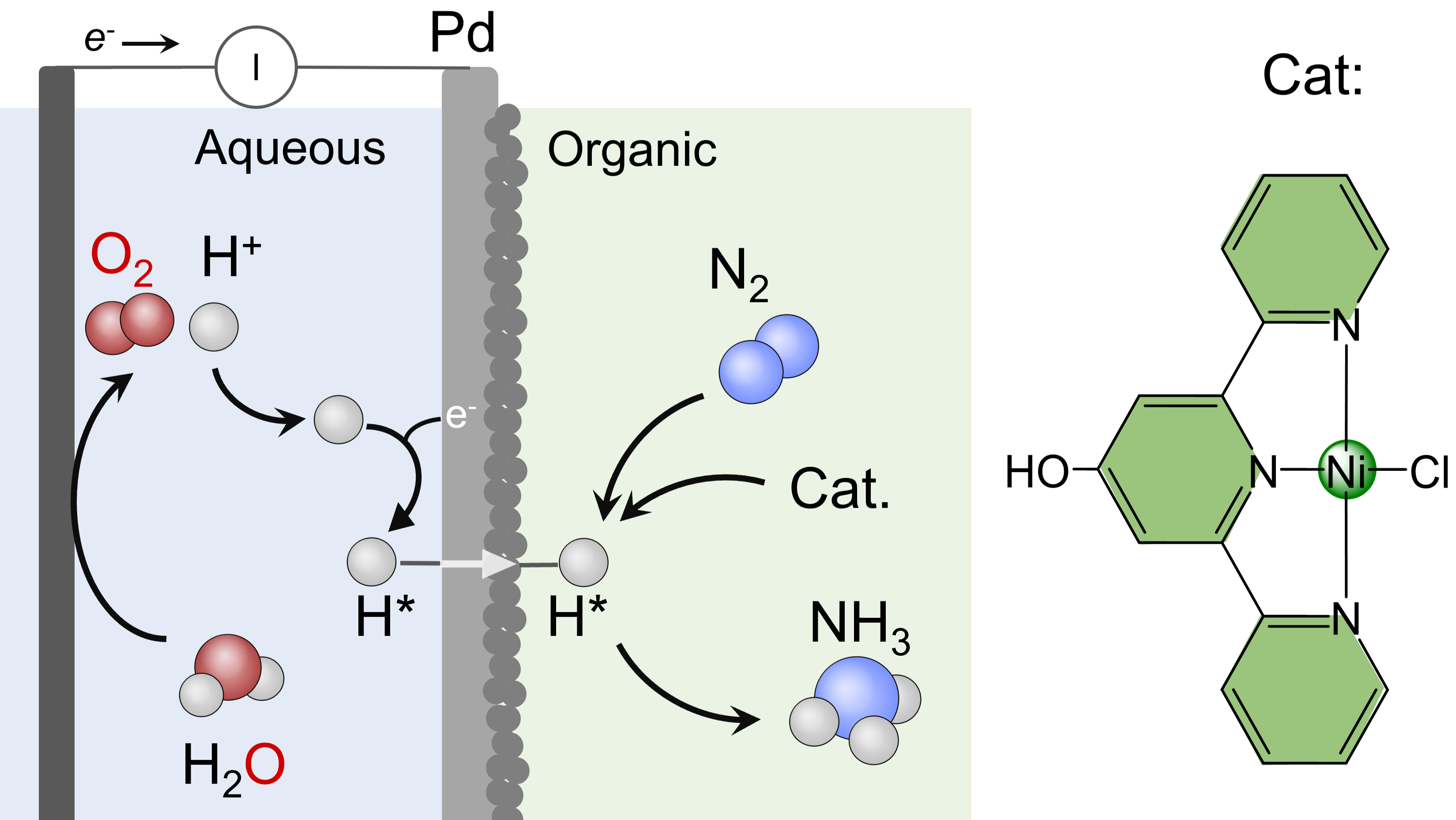 Ammonia production is a cornerstone of modern industry and society, yet the conventional Haber-Bosch process accounts for nearly 2% of the global CO2 emissions. A promising potentially greener alternative ambient temperature, low pressure electrochemical ammonia synthesis, though effective systems in this context have not yet been developed. To this end, this study develops a reactor platform that integrates a palladium membrane reactor coupled with a mono-terpyridine nickel molecular catalyst. This system achieved a peak Faradaic efficiency of 38% for ammonia production at current density of -0.85 mA.cm-2, with H2 detected as a secondary by-product. In-situ spectroscopic analysis, electroanalytical techniques, and computational modelling have revealed a unique catalyst mechanism that entails the formation of a Ni-H species generated from the active hydrogen from the Pd membrane as a key intermediate in the reaction route. The insights gained form this unique system stand to aid the development of practical ammonia production systems while expanding the community’s knowledge base on dinitrogen activation.