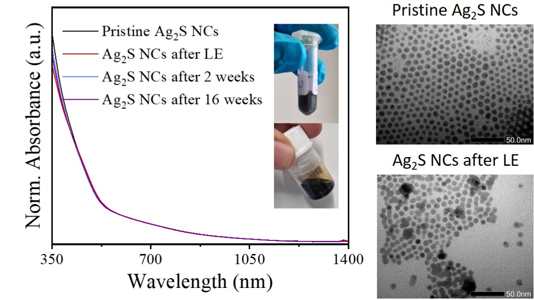 Self-powered near-infrared (NIR) detection technologies attract immense interest both from scientific and industrial perspectives due to their vital applications in environmental monitoring, night vision, and imaging in remote locations. Solution-processed colloidal semiconductor nanocrystals (NCs) have been a centre of interest among third-generation devices, offering band gap tunability, strong quantum confinement, and lower cost and large-scale fabrication. Unfortunately, the dominant NC families employed in infrared (IR) detectors are based on toxic heavy metals, such as Cd, Pb, and Hg, which restrict their use in consumer electronics and biomedical technologies under the European RoHS regulation (Restriction of the Use of Hazardous Substances). To address this limitation, silver chalcogenide (Ag2E, where E = S, Se, or Te)-based NCs have emerged as a promising class for near IR and short-wave IR detection, offering favourable bandgaps in the IR region (Ag2S ~0.9-1.3 eV, Ag2Se ~0.15 eV, Ag2Te ~0.3 eV), making them appealing from health and environmental safety perspectives. However, most Ag2E NC-based photodetectors still rely on solid-state ligand exchange protocols because solution-phase ligand exchange often fails due to poor colloidal stability and surface degradation of NCs during the process. A major disadvantage of this method is that it requires multiple layer-by-layer processing steps, which increase fabrication time, material consumption, and can lead to non-uniform or low-quality films. Most attempts at Ag2E NC solution-phase ligand exchange fail because the weak Ag–chalcogen surface bonds, which can easily be disrupted by polar solvents or reactive short ligands, lead to aggregation and/or loss of optical and electronic properties.