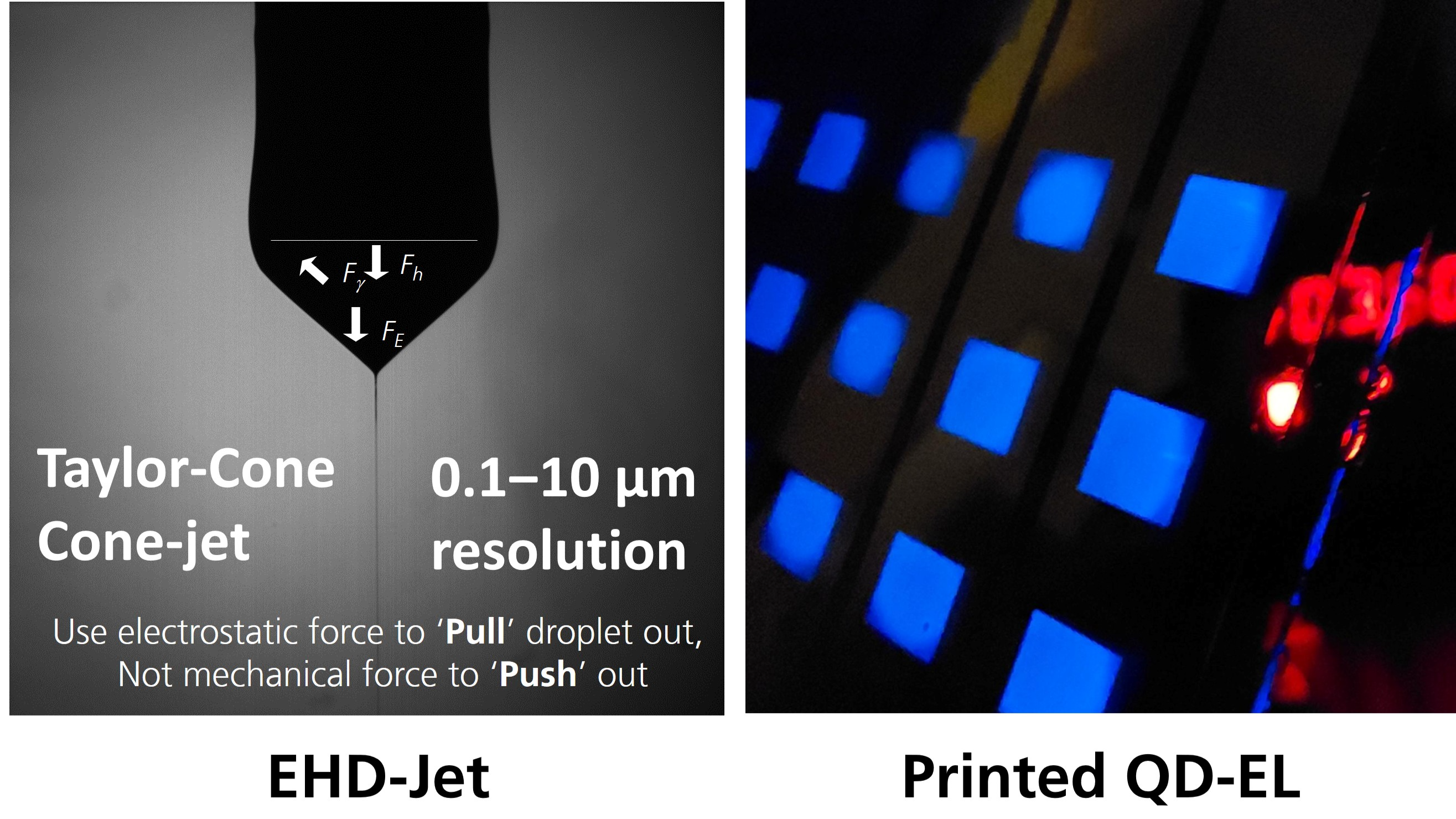 Particularly, EHD-jet printing enables ultra-fine patterning by generating droplets significantly smaller than the nozzle diameter. By optimizing jetting modes, nanohybrid features with pitches down to ~5 µm (≈5,080 pixels per inch, PPI) were produced, and fully functional EL pixels with lateral dimensions of ~21 µm (≈300 PPI) were fabricated entirely under ambient conditions. These results demonstrate that printing-based processes can reliably achieve high-resolution, display-grade QD-EL structures.