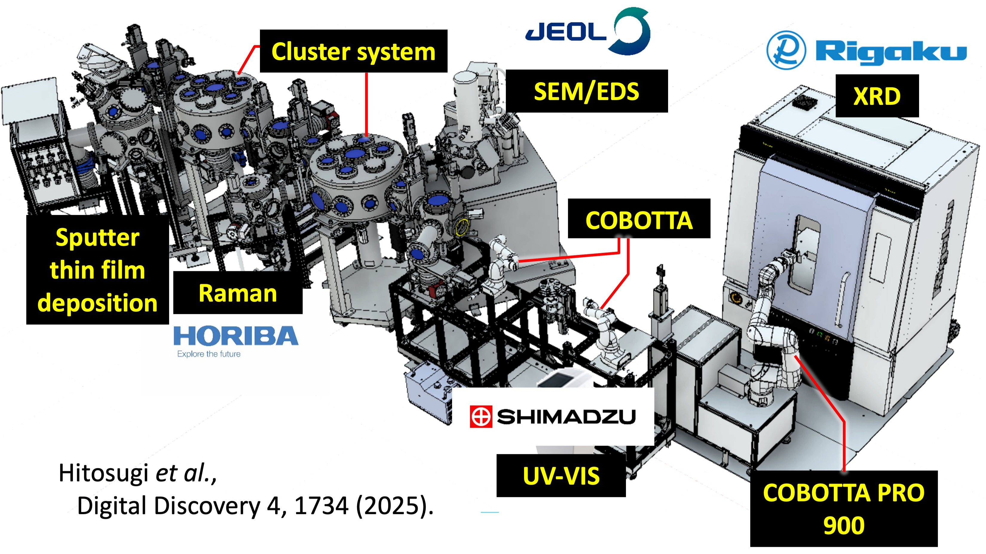Here, we report a modular self-driving laboratory (SDL) for solids and thin films [1–4]. The SDL orchestrates all stages of the experimental cycle—including sample transfer, synthesis, characterization, and iterative optimization. Data acquisition spans X-ray diffraction, scanning electron microscopy, Raman spectroscopy, and optical transmittance measurements. A Bayesian optimization enables autonomous exploration of the parameter space and rapid identification of optimal conditions.