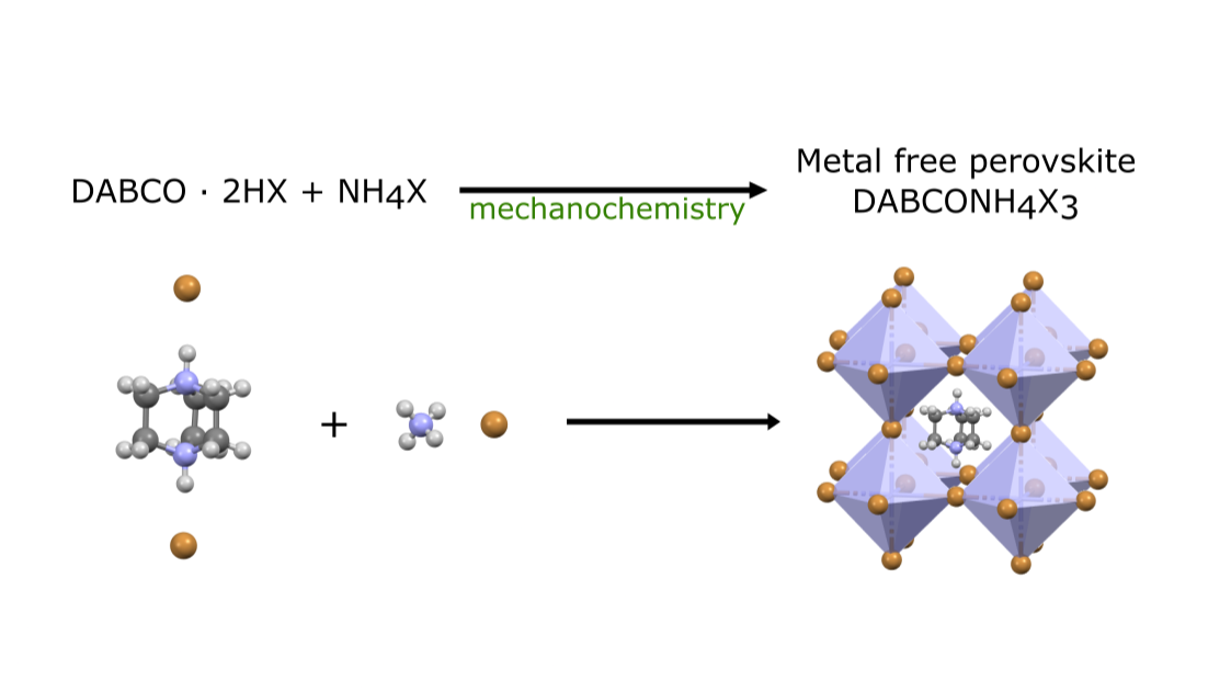 In this talk, we present a facile mechanosynthesis of DABCONH4X3 (X = Cl, Br, I). Due to the nature of mechanosynthesis, the process is easily scalable and solvent free, avoiding solubility issues, and results in a phase-pure perovskite powder. The properties and quality of the powder is thoroughly analyzed using a wide variety of crystallographic and optical characterization techniques. Our findings highlight the potential of mechanochemistry to overcome the synthesis challenges of metal free perovskites, paving the way for their future application in sustainable (optoelectronic) devices.