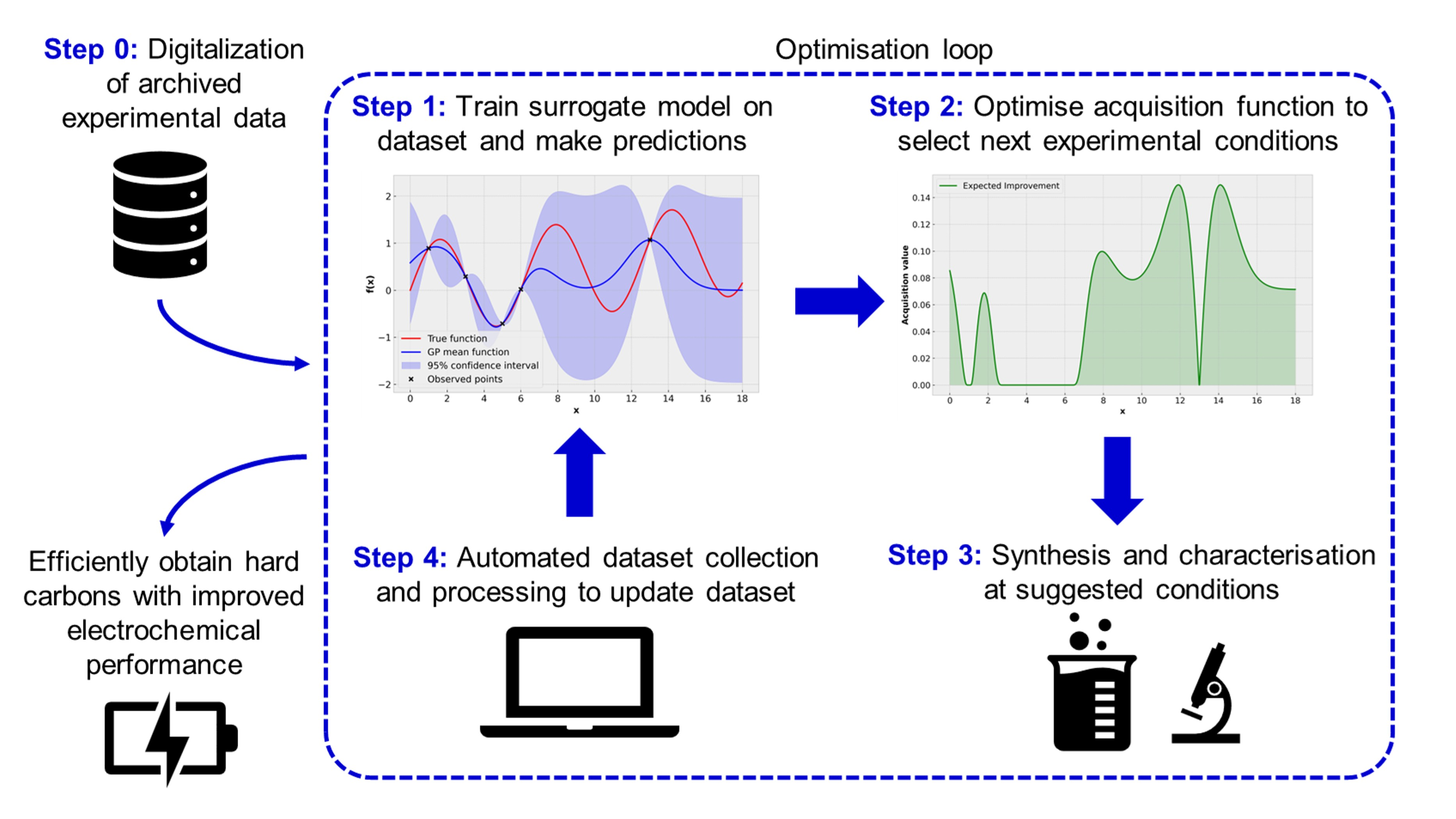 Hard carbons are currently the most promising candidates for anode materials in sodium-ion batteries (SIBs). [1] The disordered structure of hard carbons featuring high interlayer spacing, defects and pores provides suitable sites for sodium ion storage. The relationship between the structural features of glucose derived hard carbons and their electrochemical behaviour was previously reported. [2,3] The interplay of these features suggests there may be an optimal hard carbon microstructure which may result in improved electrochemical performance. Therefore, strategies for improving the electrochemical performance of hard carbons include tuning their intrinsic properties via changing the synthetic conditions. [4] In the study of glucose derived hard carbons the synthetic method consists of initial hydrothermal carbonisation of glucose followed by high temperature pyrolysis. Previously, only the pyrolysis temperature was varied in the synthetic process. This showed for example that increasing the pyrolysis temperature results in greater pore size which is beneficial for sodium storage but decreases the defect concentration and interlayer spacing which is detrimental to sodium storage. [2] Exploring the large space of remaining possible experimental conditions in this synthetic process is investigated using a data-driven approach with the goal of increasing the efficiency at which optimal conditions are found. A closed loop Bayesian optimisation workflow for investigating synthetic conditions to obtain hard carbons with improved electrochemical performance is being developed. The workflow consists of training a surrogate model on a dataset developed from archived experimental data to make predictions on new synthetic conditions. Based on these predictions the next experimental condition is selected for investigation. The results from the synthesis and characterisation at the suggested conditions are then collected and processed in an automated way to update the dataset and the surrogate model. A custom toolkit for the automated analysis and extraction of important features from both the electrochemical and microstructure characterisation is implemented. Furthermore, the use of a research data management system in the developed process allows for the effective integration of data from the experimental workflow with the computational workflow. The developed process provides a more efficient and data-driven approach to experimental work in the field of hard carbon materials for SIBs.